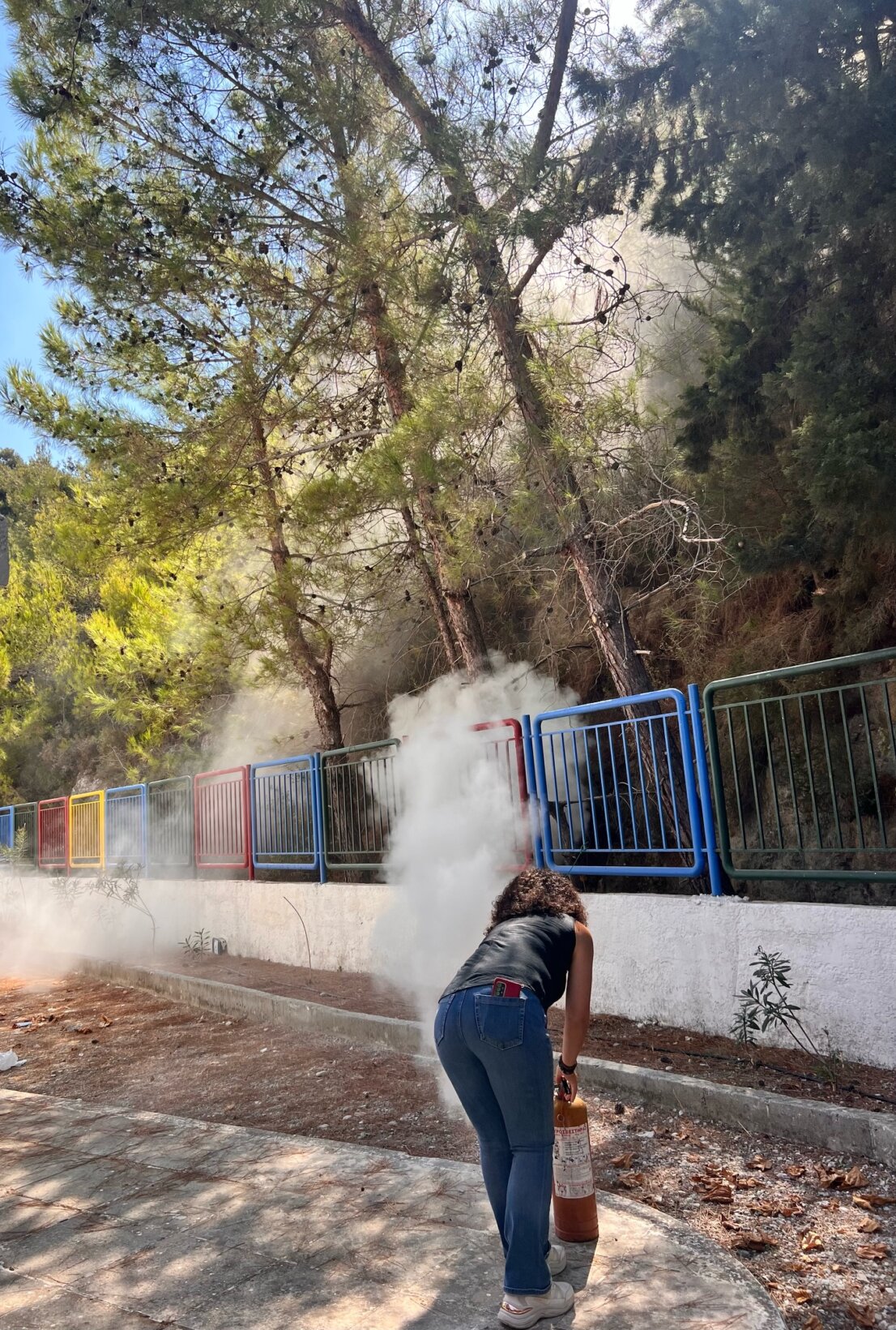 Στη συνέχεια, οι εκπαιδευτικοί μετέβησαν στην αυλή του σχολείου όπου πραγματοποιήθηκε εξάσκηση στη σωστή χρήση πυροσβεστήρα ξηράς κόνεως.