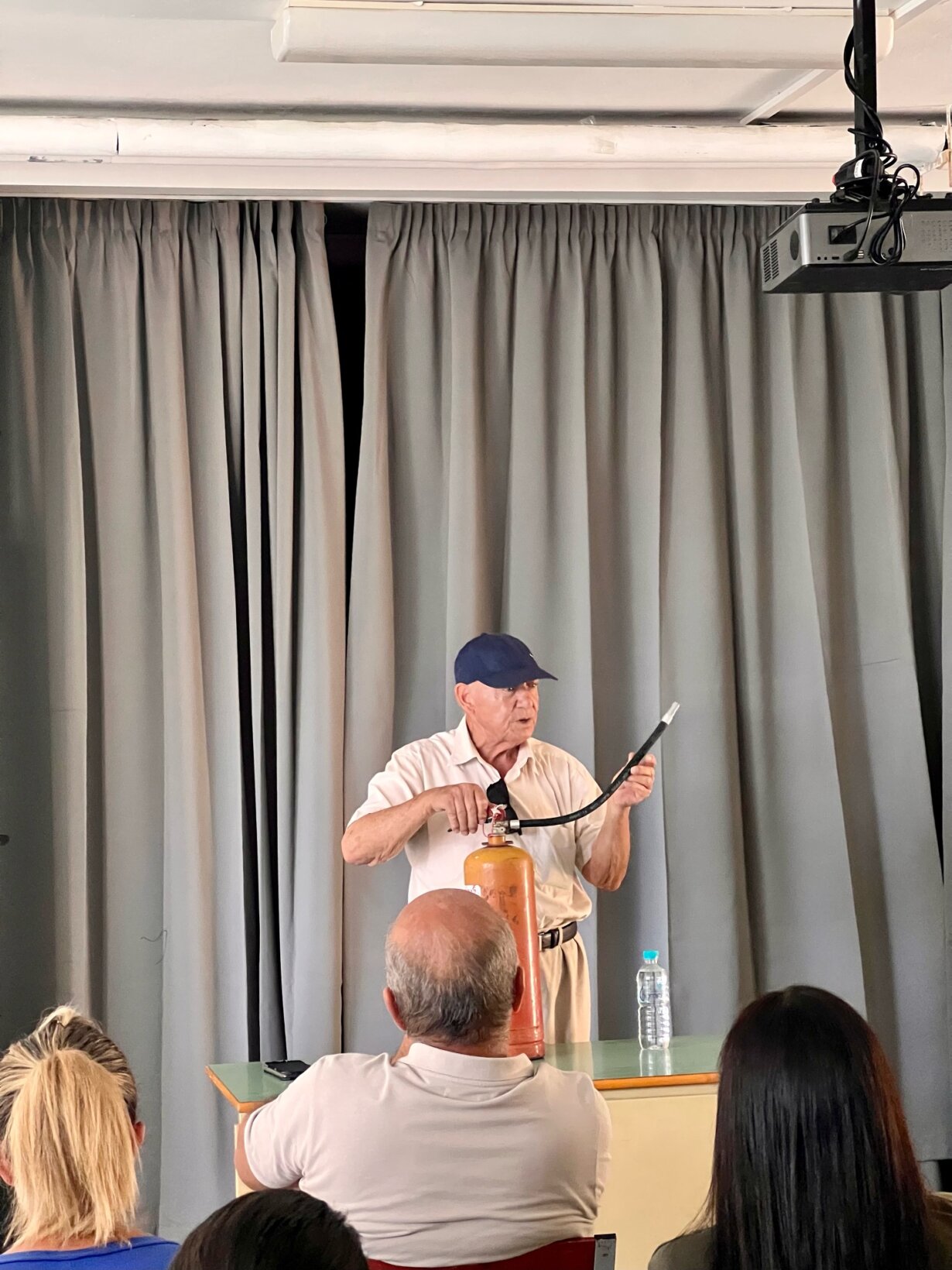 Κατόπιν πρόσκλησης της Διεύθυνσης προς την Πυροπροστασία Ρόδου, για ενημέρωση των εκπαιδευτικών πάνω σε θέματα πυρασφάλειας και πυρόσβεσης, επισκέφτηκε το σχολείο μας στις 6 Σεπτεμβρίου 2024, ο κ. Εμμανουήλ Χατζημιχαήλ (Απόστρατος Ανώτατος Αξιωματικός του Πυροσβεστικού Σώματος).