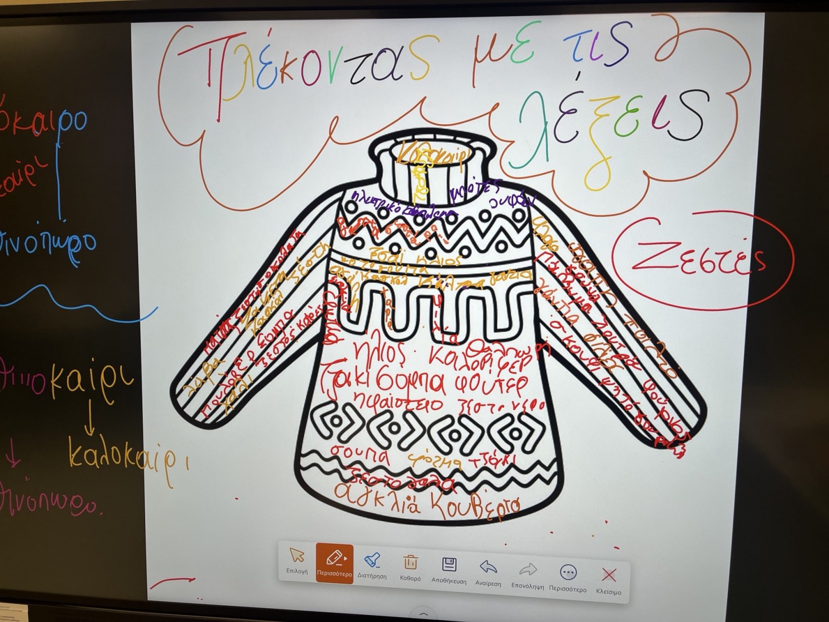 Ημέρα Ελληνικής γλώσσας και οι μαθητές της Ε τάξης αξιοποίησαν το βιβλίο “Ο ραφτάκος των λέξεων” ! Μιλήσαμε για την αξία των λέξεων , για το νόημα που κρύβουν και για τον πλούτο της Ελληνικής γλώσσας ! Βρήκαμε συνώνυμες αλλά και αντίθετες λέξεις ! Βρήκαμε ξένες λέξεις που έχουν τις ρίζες τους στις ελληνικές ! Φτιάξαμε ακόμα και δικές μας λέξεις !! Παίξαμε φιδάκι και τέλος ζωγραφίσαμε το πουλόβερ χρησιμοποιώντας μόνο ” Ζεστές ” λέξεις ! Κυριάρχησαν οι λέξεις φωτιά , ήλιος και τζάκι αλλά και οι λέξεις αγάπη, αγκαλιά και φροντίδα .