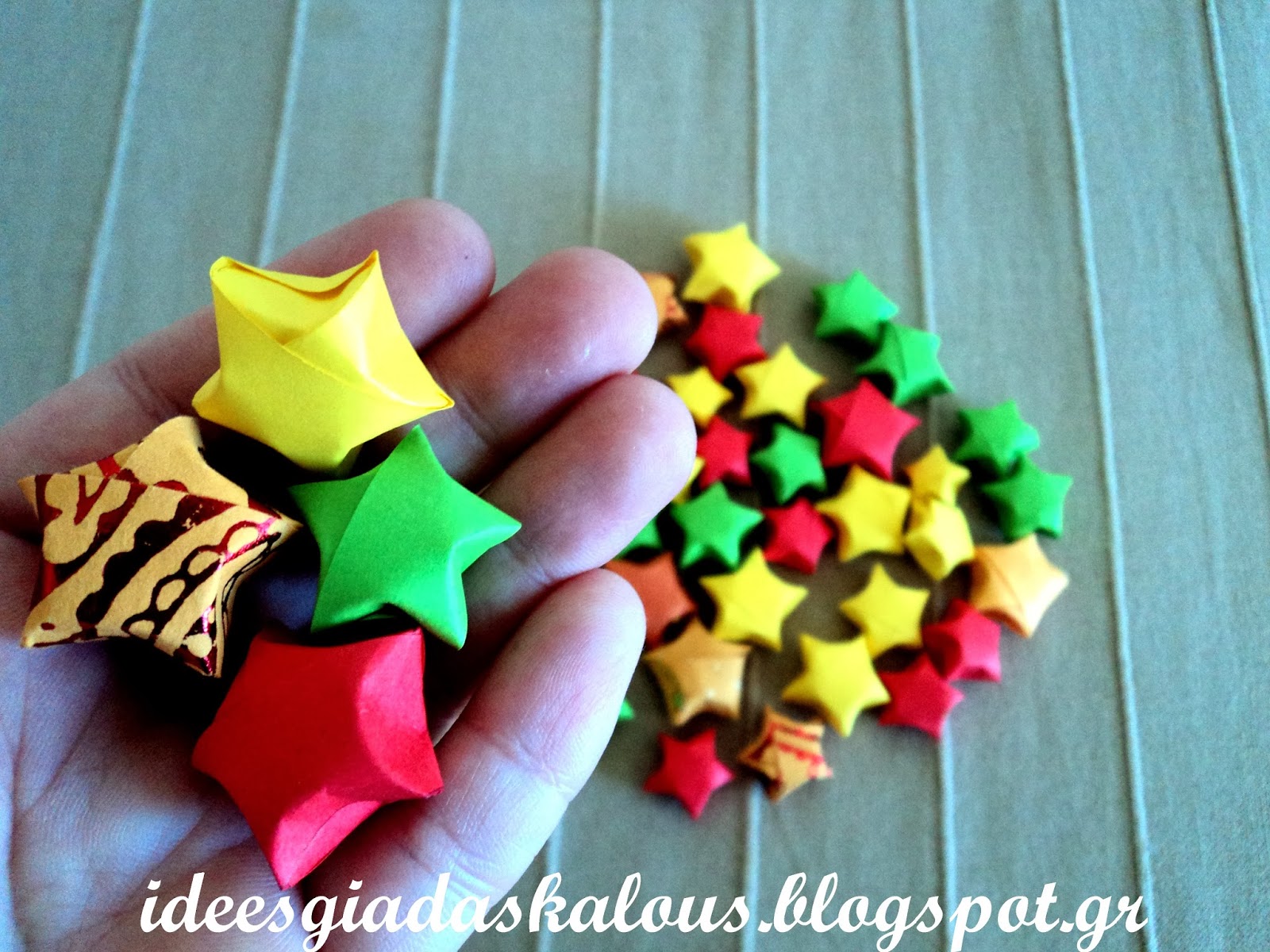 Μια πολύ απλή κατασκευή που θα μπορούν να κάνουν και τα παιδιά! (από Τετάρτη και πάνω σίγουρα!) Φτιάξτε πολλά αστεράκια σε διάφορα χρώματα και κολλήστε τα σε κάρτες, φτιάξτε γιρλάντες, γεμίστε με αυτά μεγαλύτερα αστέρια από χαρτόνι, γεμίστε βάζα διακοσμητικά, κρεμάστε τα στο δέντρο σας ή στολίστε με αυτά τα χριστουγεννιάτικα γλυκά σας!