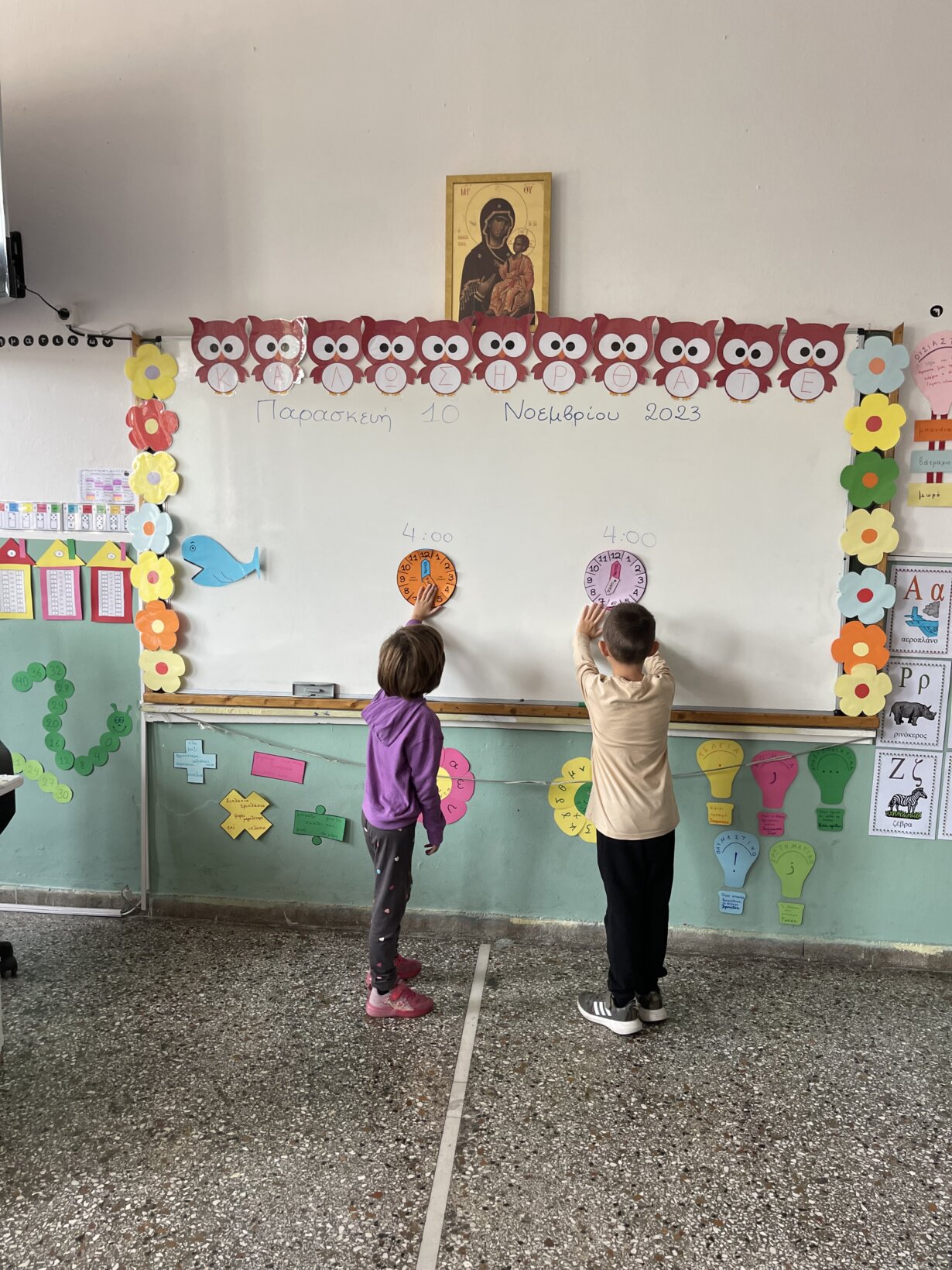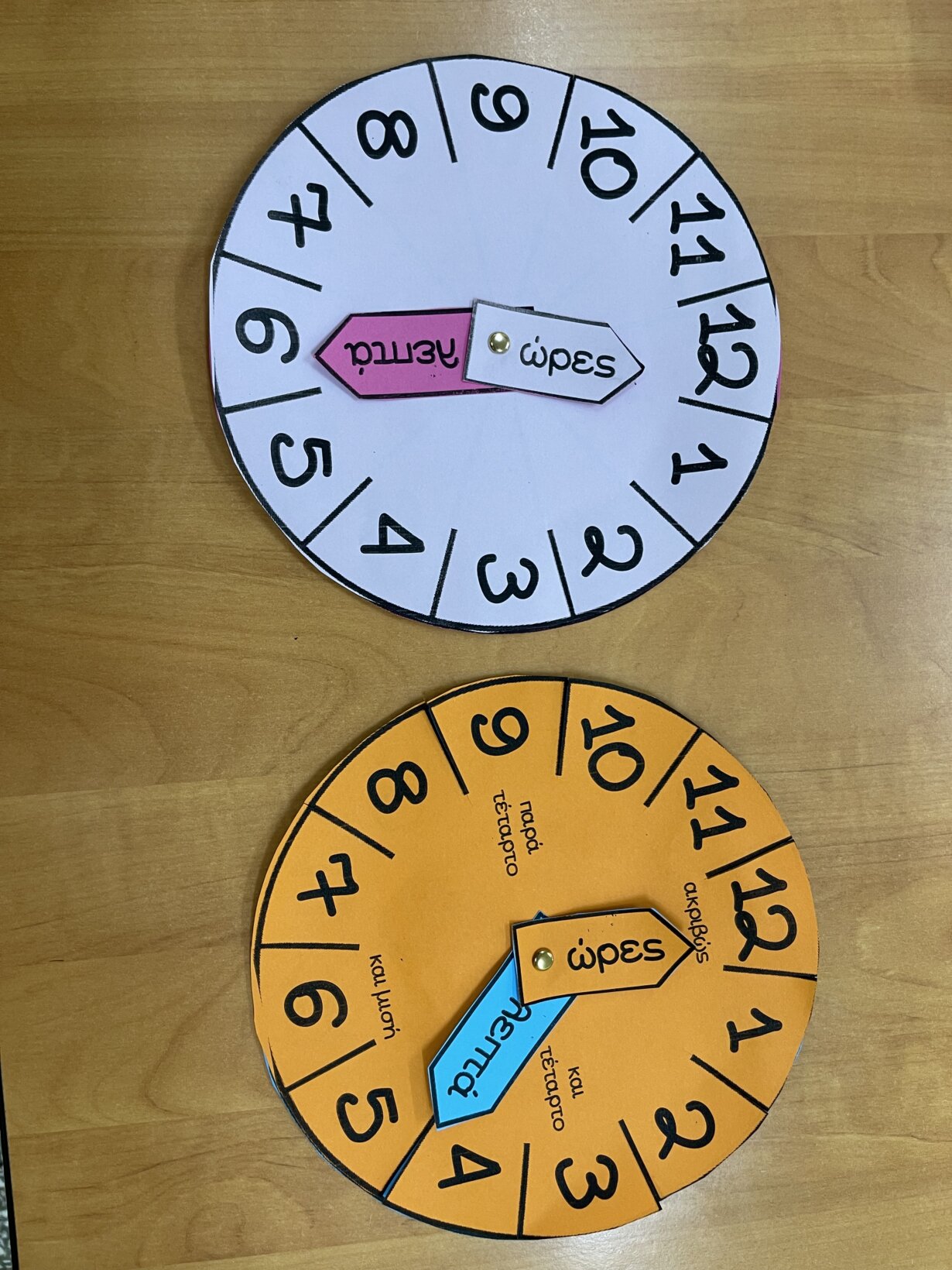 Στα πλαίσια του μαθήματος της Μελέτης στην ενότητα «χρόνος», κάναμε μια εισαγωγή στην εκμάθηση της ώρας και για το σκοπό αυτό χρησιμοποιήσαμε το εκπαιδευτικό μας ρολόι με τα βοηθητικά καρτελάκια περιμετρικά. Τα παιδιά εξοικειώνονται με το ρολόι και κάνουν προφορικά εξάσκηση στα λεπτά που δείχνει ο λεπτοδείκτης. Έπειτα με τη βοήθεια των χειραπτικών ρολογιών που φτιάξαμε με χαρτόνι μαθαίνουμε να λέμε την ώρα και με τους δυο τρόπους.