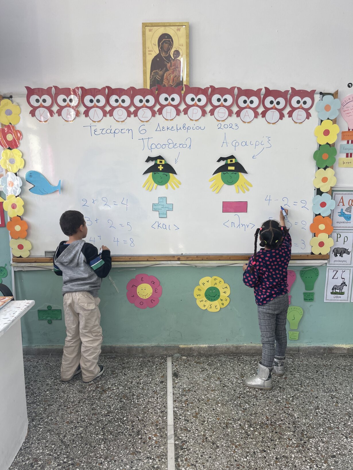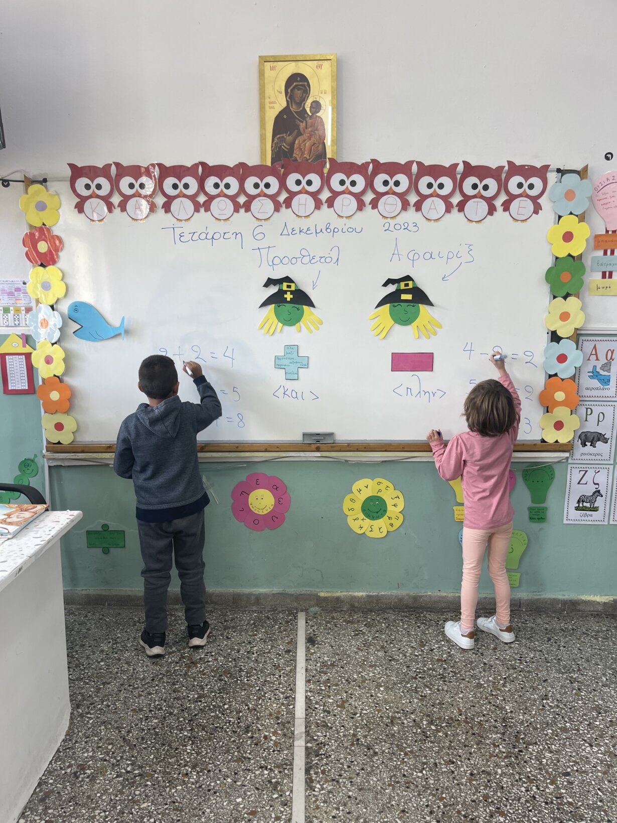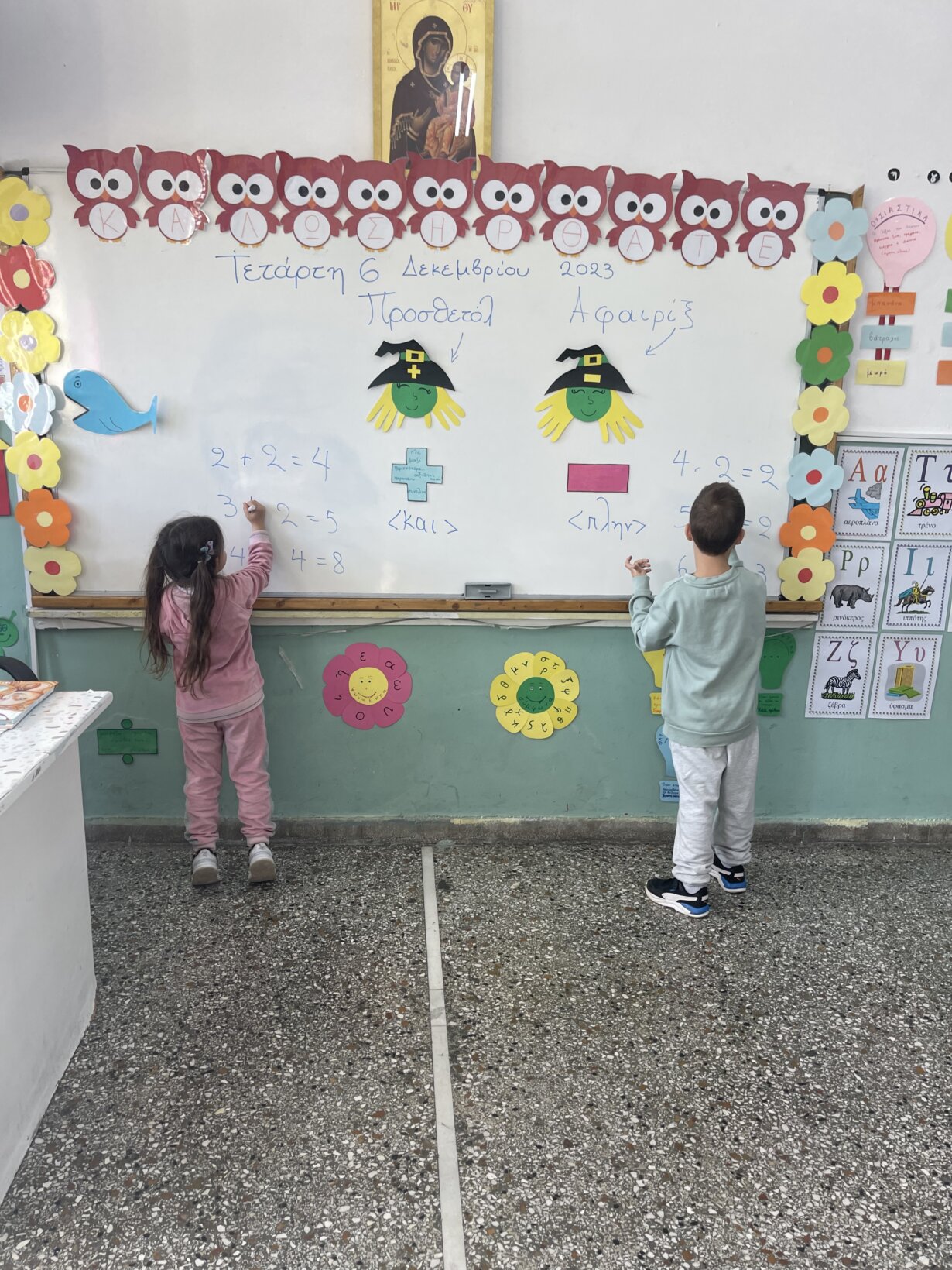 Σήμερα μας επισκέφθηκαν οι μάγισσες των Μαθηματικών ! Η μάγισσα Προσθετόλ η οποία έχει σύμβολο της το «και» και τα βάζει όλα μαζί και η μάγισσα Αφαιρίξ που έχει ως σύμβολο της το «πλην» και αφαιρεί. Κάναμε εξάσκηση με τα σύμβολα των πράξεων στον πίνακα και τα παιδιά εξοικειώθηκαν με τις δυο αντίστροφες πράξεις. Ο ενθουσιασμός τους ήταν μεγάλος !