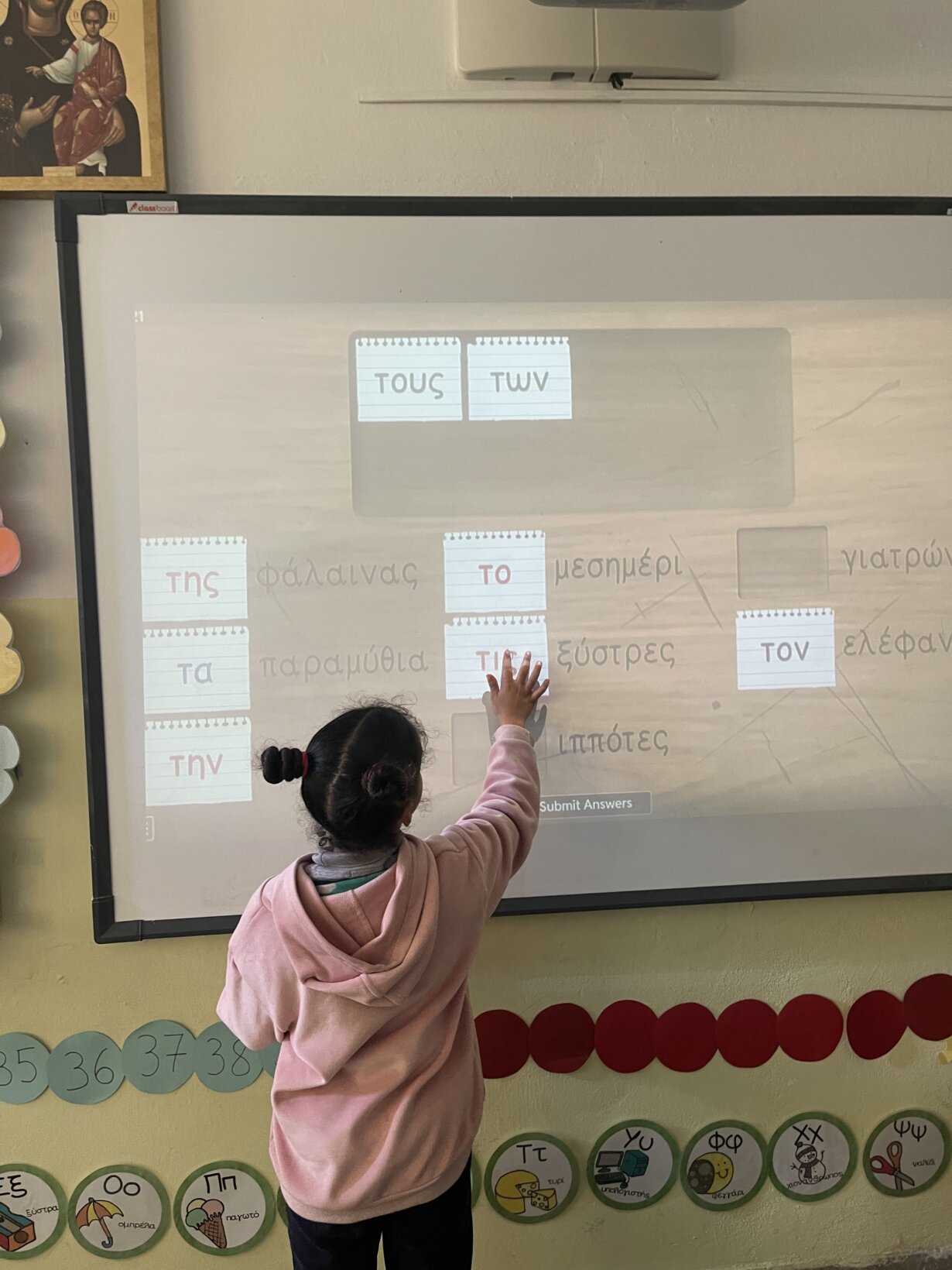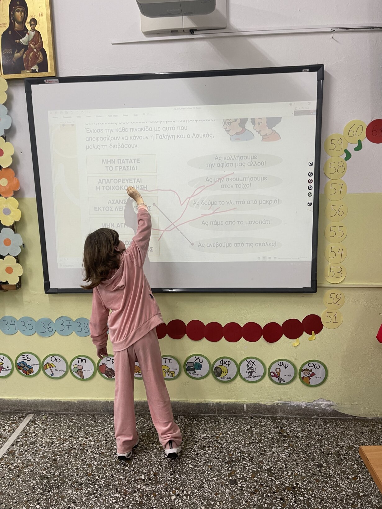 Το πρώτο μας διαδραστικό μάθημα είναι γεγονός ! Με τη βοήθεια του διαδραστικού πίνακα της τάξης μας, το μάθημα μετατράπηκε σε παιχνίδι, και το παιχνίδι σε μάθημα ! Τόσο στο μάθημα της γλώσσας, όσο και σε αυτό των μαθηματικών, παίξαμε διαδραστικά παιχνίδια εμπέδωσης της ύλης μας, συμπληρώσαμε φύλλα εργασίας και κάναμε διαγωνισμό ανά ομάδες ! Οι μικροί μαθητές μέσω της ανακαλυπτικής μάθησης ενίσχυσαν την αυτονομία και την αυτοπεποίθηση τους στη μαθησιακή διαδικασία. Ο πολύτιμος αυτός βοηθός, η διαδραστική οθόνη, θα εμπλουτίζει κάθε μάθημά μας !!