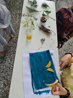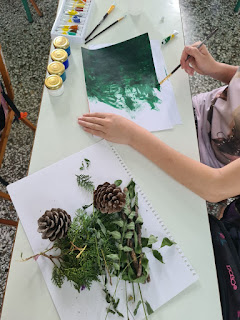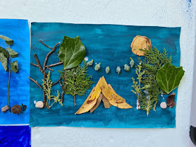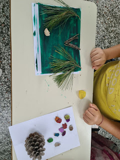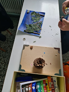 Πιο συγκεκριμένα οι Μαθητές της Ε΄-ΣΤ΄ Τάξης χρησιμοποίησαν φυσικά υλικά που μάζεψαν απ’ τον προαύλιο χώρο του Σχολείου μας (κουκουνάρια, ξύλα, λουλούδια, πευκοβελόνες, ξερά φύλλα) για να κατασκευάσουν ένα τοπίο στο δάσος.