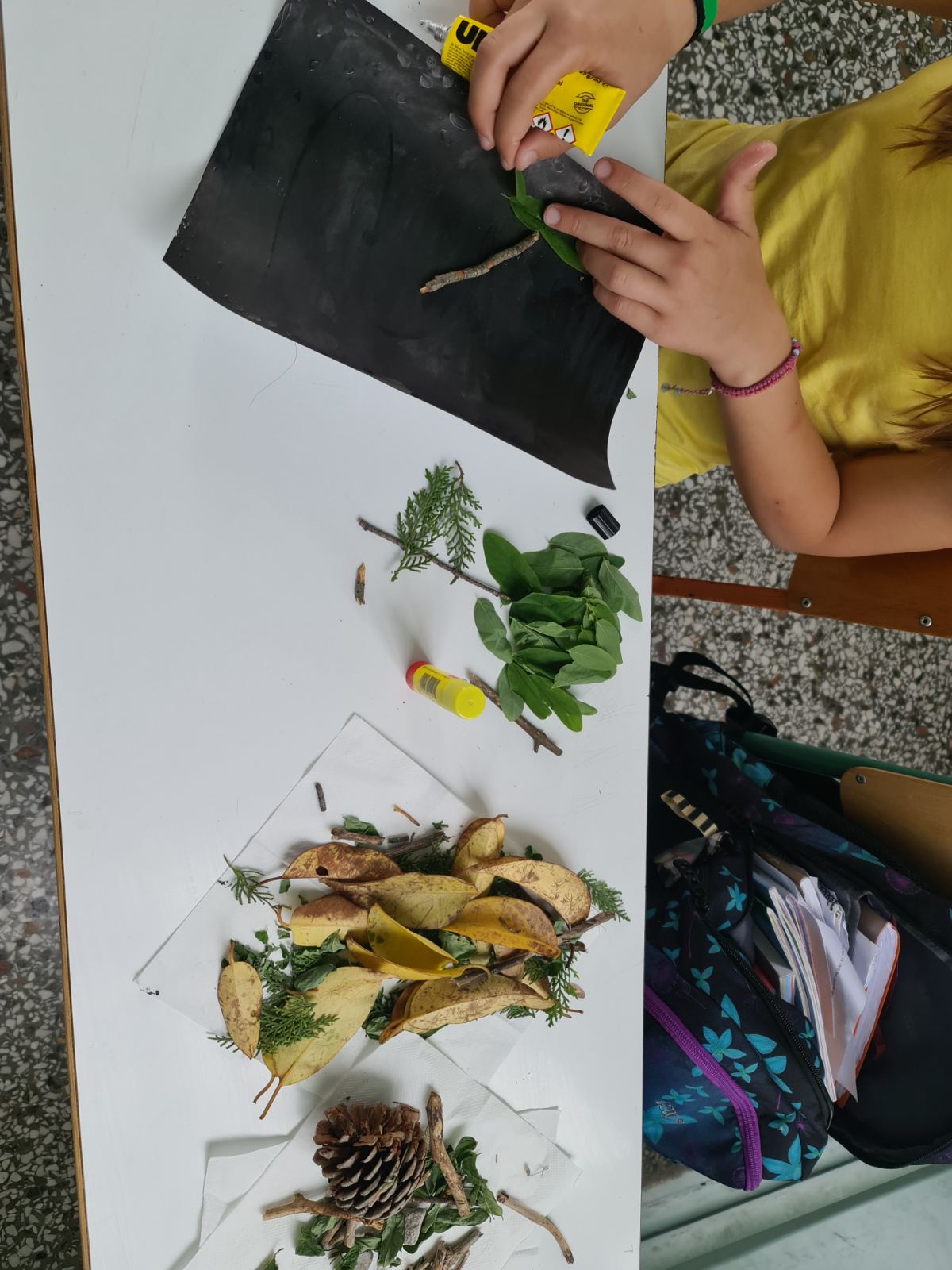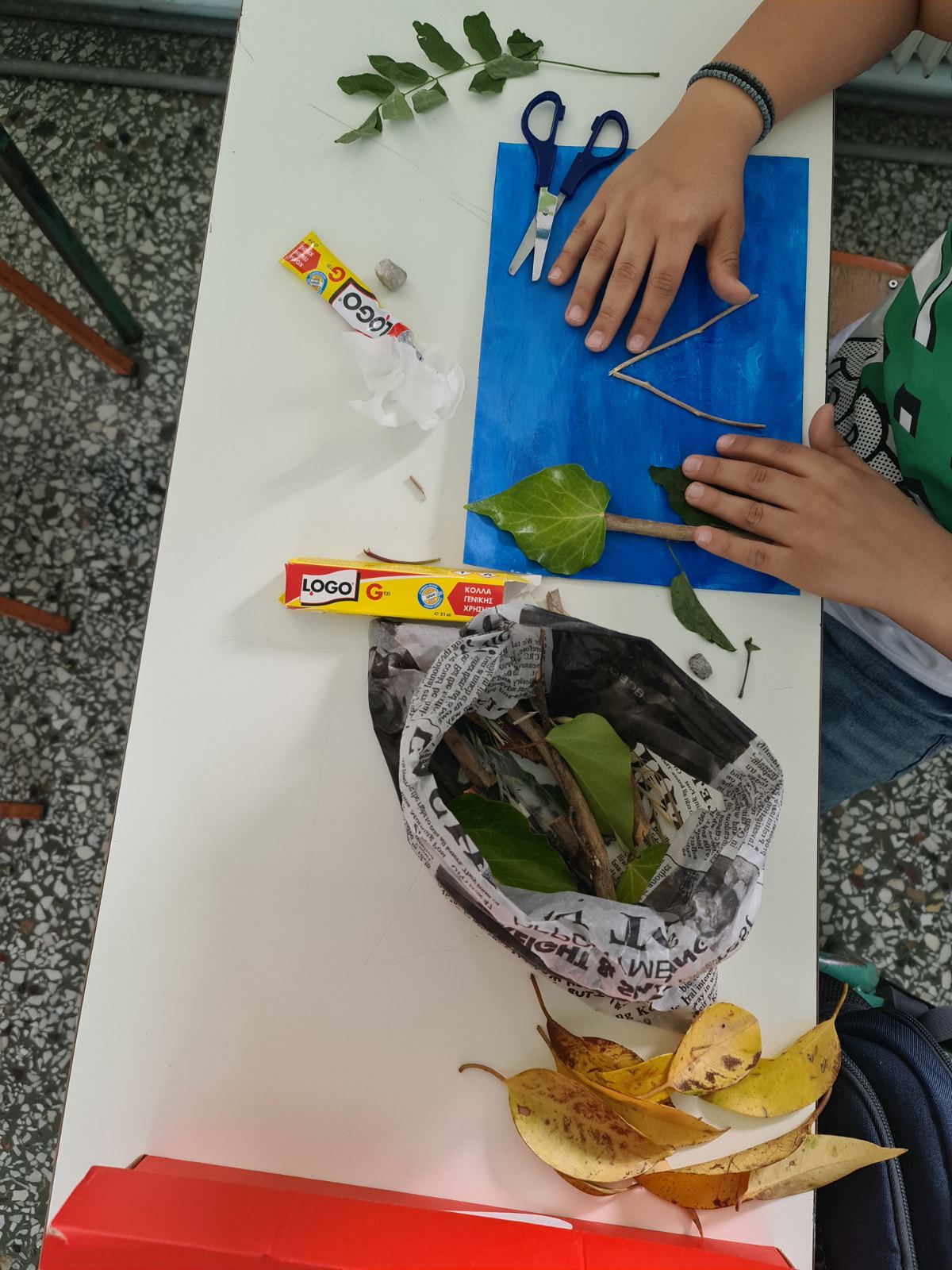 Πιο συγκεκριμένα οι Μαθητές της Ε΄-ΣΤ΄ Τάξης χρησιμοποίησαν φυσικά υλικά που μάζεψαν απ’ τον προαύλιο χώρο του Σχολείου μας (κουκουνάρια, ξύλα, λουλούδια, πευκοβελόνες, ξερά φύλλα) για να κατασκευάσουν ένα τοπίο στο δάσος.