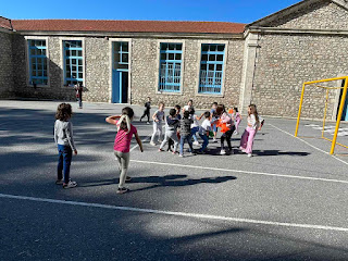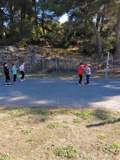 στο προαύλιο οι μαθητές/τριες ήταν χωρισμένοι ανά 2 τάξεις .(Α-Β, Γ-Δ , Ε -Στ).