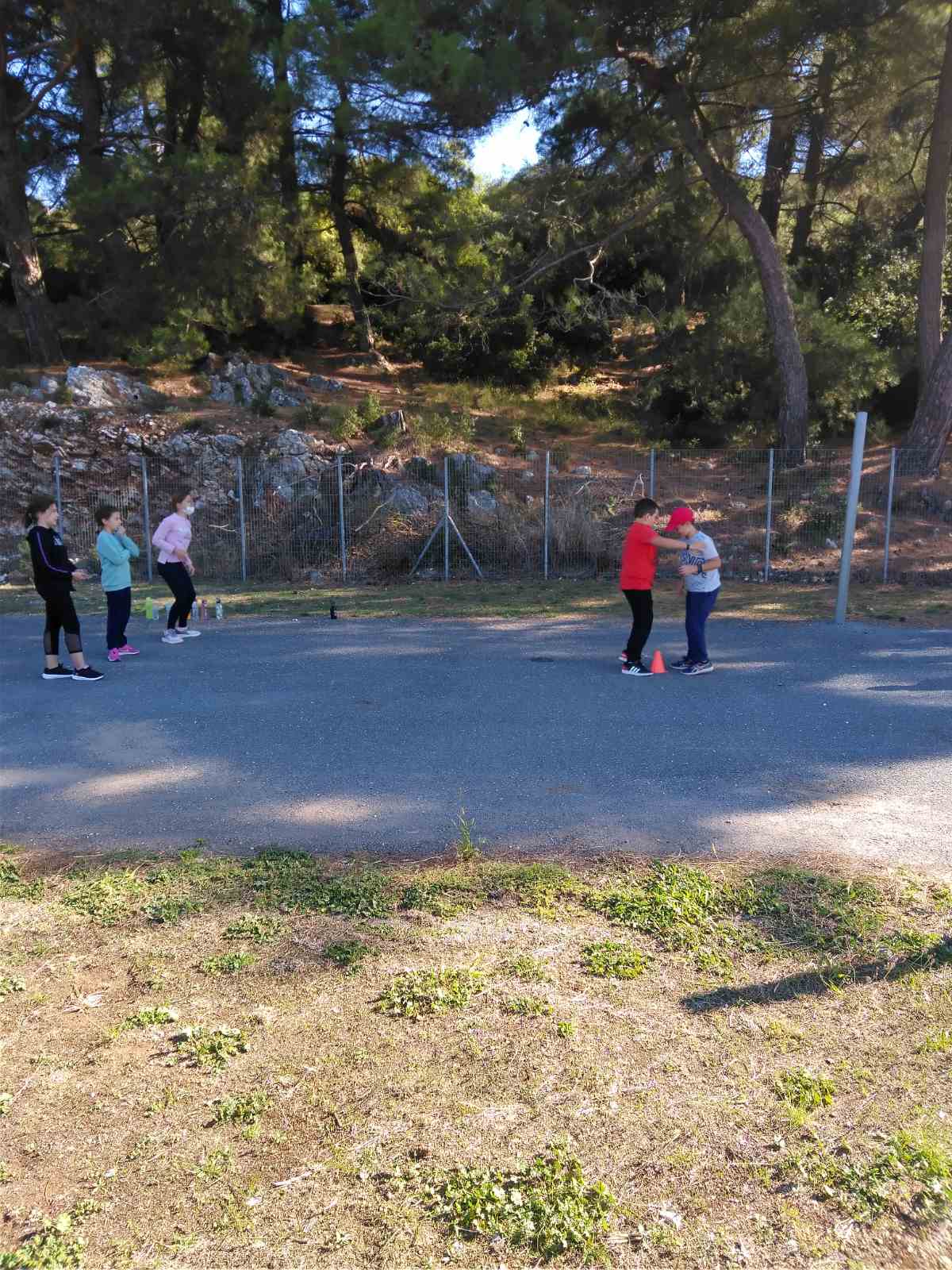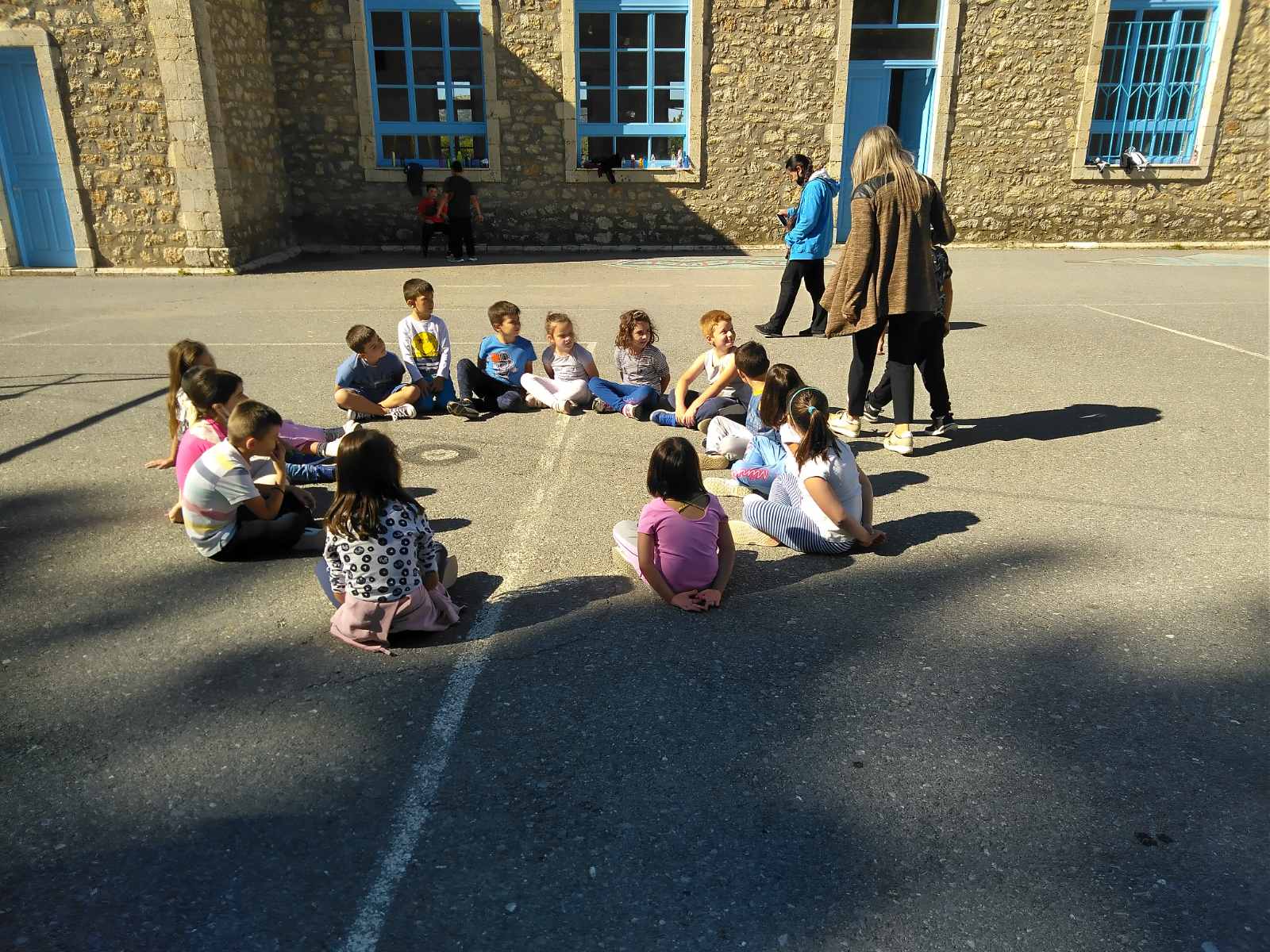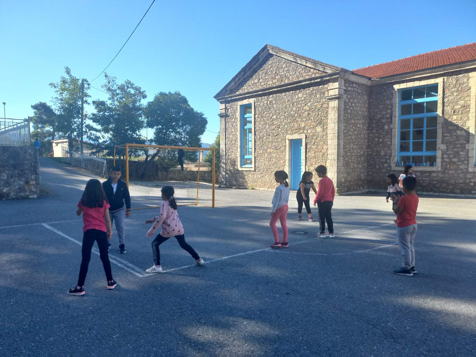 στο προαύλιο οι μαθητές/τριες ήταν χωρισμένοι ανά 2 τάξεις .(Α-Β, Γ-Δ , Ε -Στ).