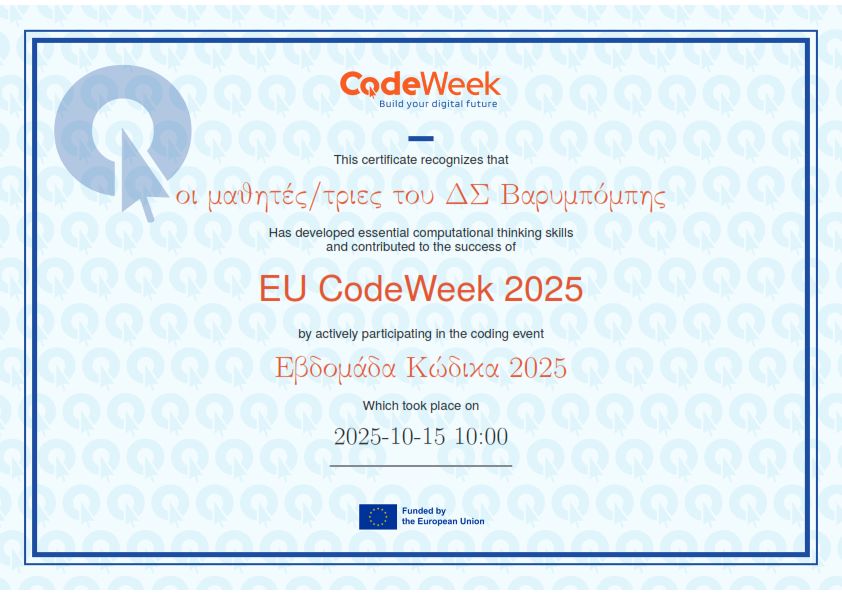 Η Ευρωπαϊκή Εβδομάδα Κώδικα 2025 φέτος πραγματοποιήθηκε από τις 11 έως τις 26 Οκτωβρίου 2025 και διοργανώθηκε με την υποστήριξη της Ευρωπαϊκής Ένωσης. Είναι μια πρωτοβουλία για την προώθηση του ψηφιακού εγγραμματισμού και της συνεργασίας, καθώς και για την στήριξη των παιδιών προκειμένου να ζωντανέψουν τις ιδέες τους μέσω του προγραμματισμού και της κωδικοποίησης.