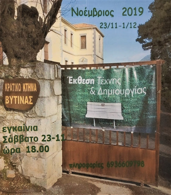 Η «7η Έκθεση Τέχνης και Δημιουργίας» φιλοξενείται αυτές τις ημέρες στο Κρατικό Κτήμα Βυτίνας. Στα εκθέματα περιλαμβάνονται χειροποίητα έργα και δημιουργίες υψηλής αισθητικής, που διατέθηκαν από ιδιώτες και επαγγελματίες της τέχνης από την τοπική περιοχή προς τέρψη των επισκεπτών. Διοργανώνεται με πρωτοβουλία του «Ομίλου Κυριών Βυτίνας» και υλοποιείται σε ετήσια βάση την τελευταία εβδομάδα του Νοεμβρίου.