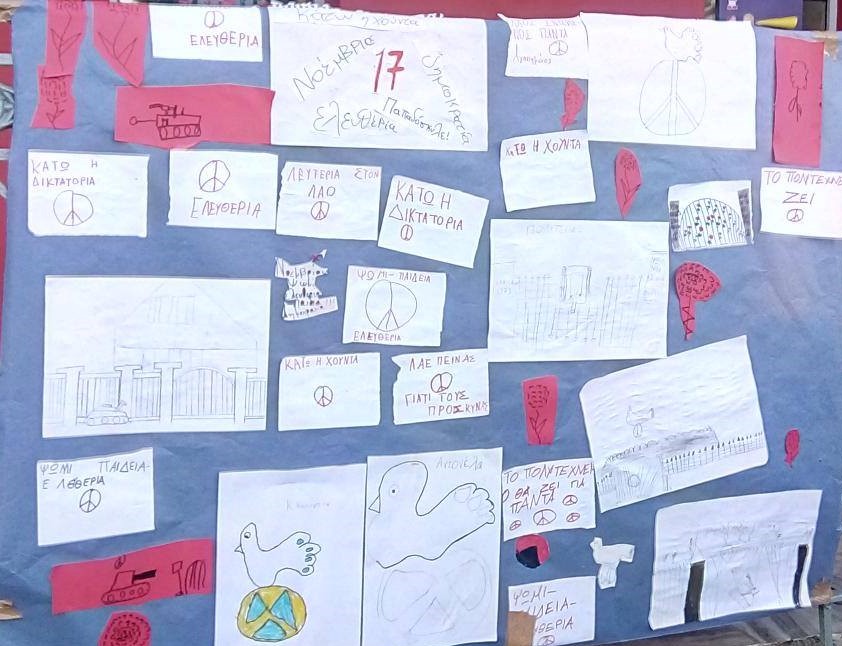 Οι μαθητές/-τριες, υποστηριζόμενοι από τους εκπαιδευτικούς, ενθαρρύνθηκαν να προσεγγίσουν έννοιες όπως Δημοκρατία, Ελευθερία, Δικτατορία, δουλεύοντας συνεργατικά, με τη συνοδεία μουσικής και στίχων τραγουδιών άρρηκτα συνδεδεμένων με την εξέγερση του Πολυτεχνείου, μέσα σε μια πολύ ευχάριστη και ζεστή ατμόσφαιρα, όπως συνήθως συμβαίνει με αυτή την ξεχωριστή σχολική εορτή.