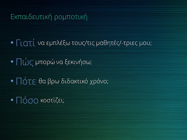 Διάχυση των εμπειριών που αποκτήθηκαν και των καλών πρακτικών που εφαρμόστηκαν στο Δημοτικό Σχολείο Βυτίνας κατά την προετοιμασία και συμμετοχή των μαθητών/-τριών στους διαγωνισμούς εκπαιδευτικής ρομποτικής των τελευταίων ετών πραγματοποιήθηκε από τον Διευθυντή του σχολείου κ. Ιωάννη Καρούντζο, στο πλαίσιο επιμόρφωσης εκπαιδευτικών για την αξιοποίηση της εκπαιδευτικής ρομποτικής ως εργαλείο για την απόκτηση γνώσεων, την ανάπτυξη δεξιοτήτων και την παροχή κινήτρων στους/στις μαθητές/-τριες.