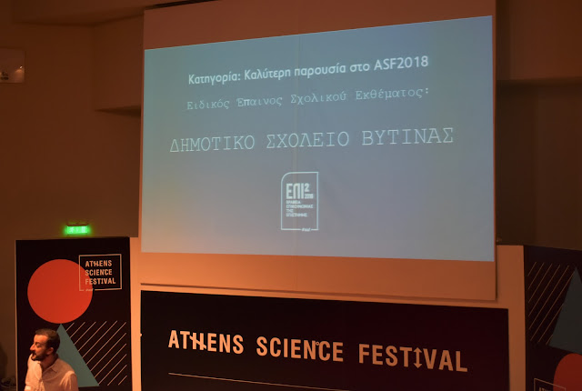 Κορυφαία στιγμή διάκρισης για το Δημοτικό Σχολείο Βυτίνας στην πρώτη απονομή βραβείων Επικοινωνίας της Επιστήμης ΕΠΙ2, που πραγματοποιήθηκε κατά την τελετή λήξης του μεγαλύτερου φεστιβάλ επιστήμης και τεχνολογίας της Ελλάδας, του Athens Science Festival, 24-29 Απριλίου 2018.
