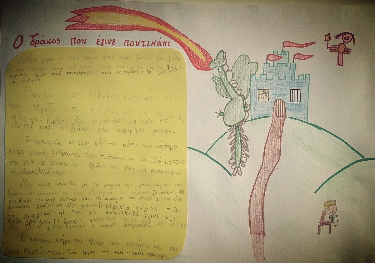 Οι μαθητές της Β’ Δημοτικού έφτιαξαν το πρώτο τους, για φέτος, παραμύθι. Με πολλή διάθεση και φαντασία ταξίδεψαν σε κόσμους μαγικούς, σε μακρινά βασίλεια με δράκους και νεράιδες, με καλούς και κακούς βασιλιάδες και με παιδιά με ψυχή γενναία…