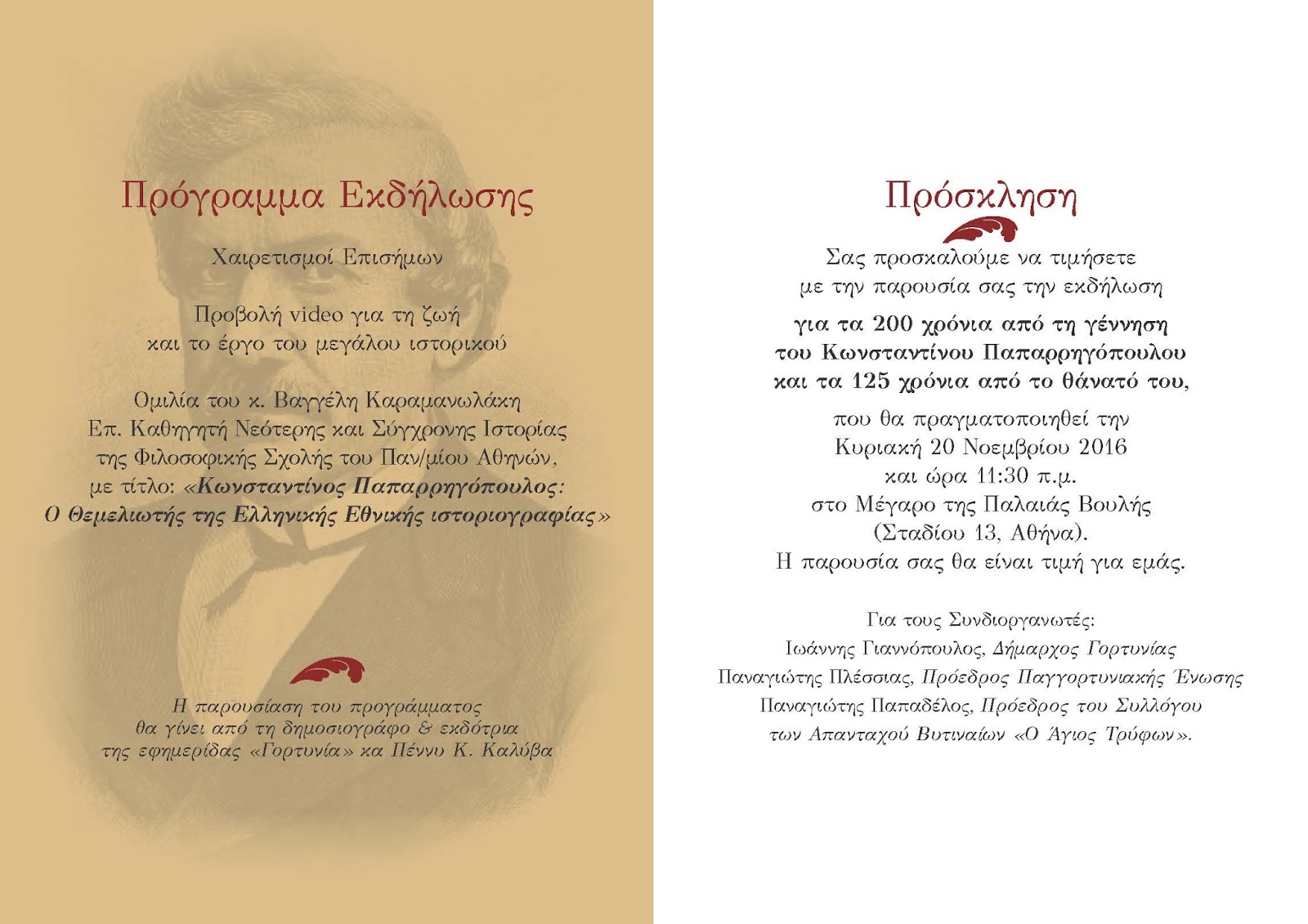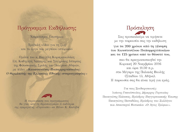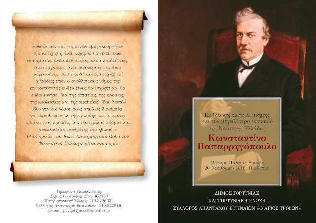 Ο Δήμος Γορτυνίας, η Παγγορτυνιακή Ένωση και ο Σύλλογος Απανταχού Βυτιναίων «Ο Άγιος Τρύφων» θα πραγματοποιήσουν τιμητική εκδήλωση για τον ιστορικό Κωνσταντίνο Παπαρρηγόπουλο την Κυριακή 20 Νοεμβρίου 2016, ώρα 11.30 π.μ. στο Μέγαρο της Παλαιάς Βουλής, οδός Σταδίου 13, Αθήνα.