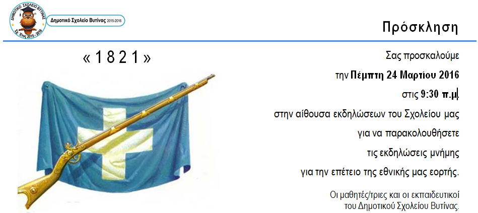 Πρόσκληση για τη σχολική εορτή της 25ης Μαρτίου Primary School of Vytina 23 Μαρτίου 2016 Εκδηλώσεις Δεν επιτρέπεται σχολιασμός στο Πρόσκληση για τη σχολική εορτή της 25ης Μαρτίου