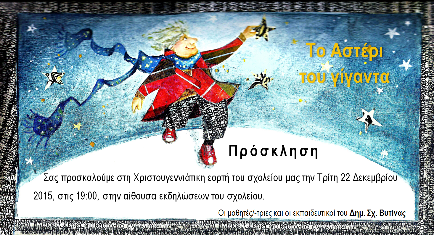 Πρόσκληση για τη Χριστουγεννιάτικη εορτή Primary School of Vytina 14 Δεκεμβρίου 2015 Εκδηλώσεις Δεν επιτρέπεται σχολιασμός στο Πρόσκληση για τη Χριστουγεννιάτικη εορτή