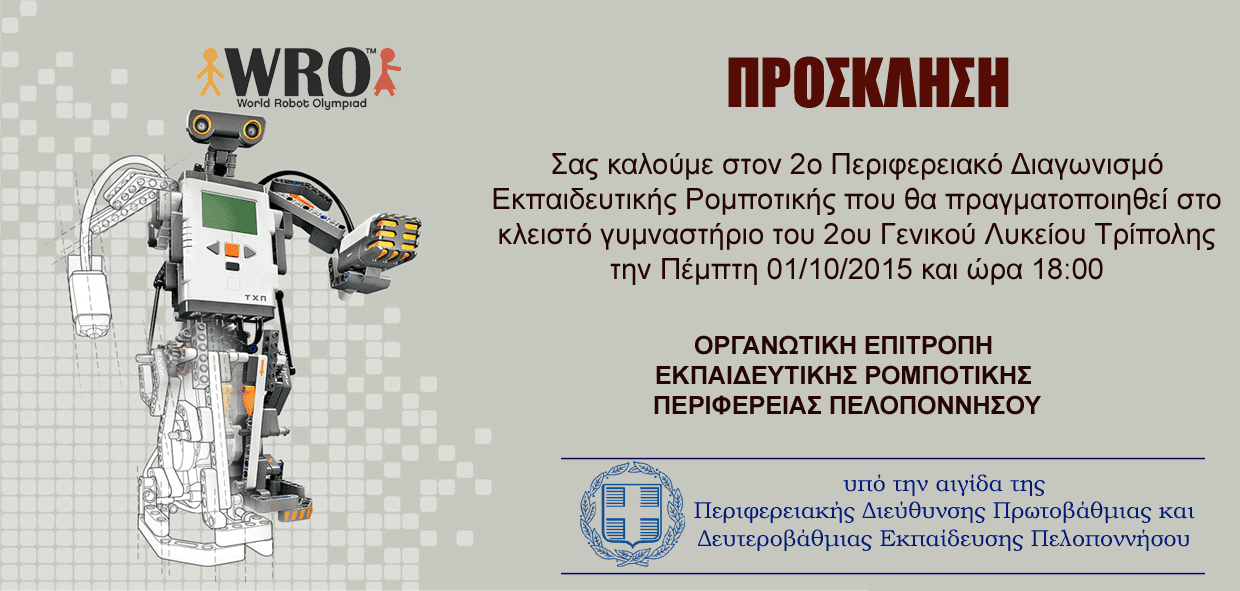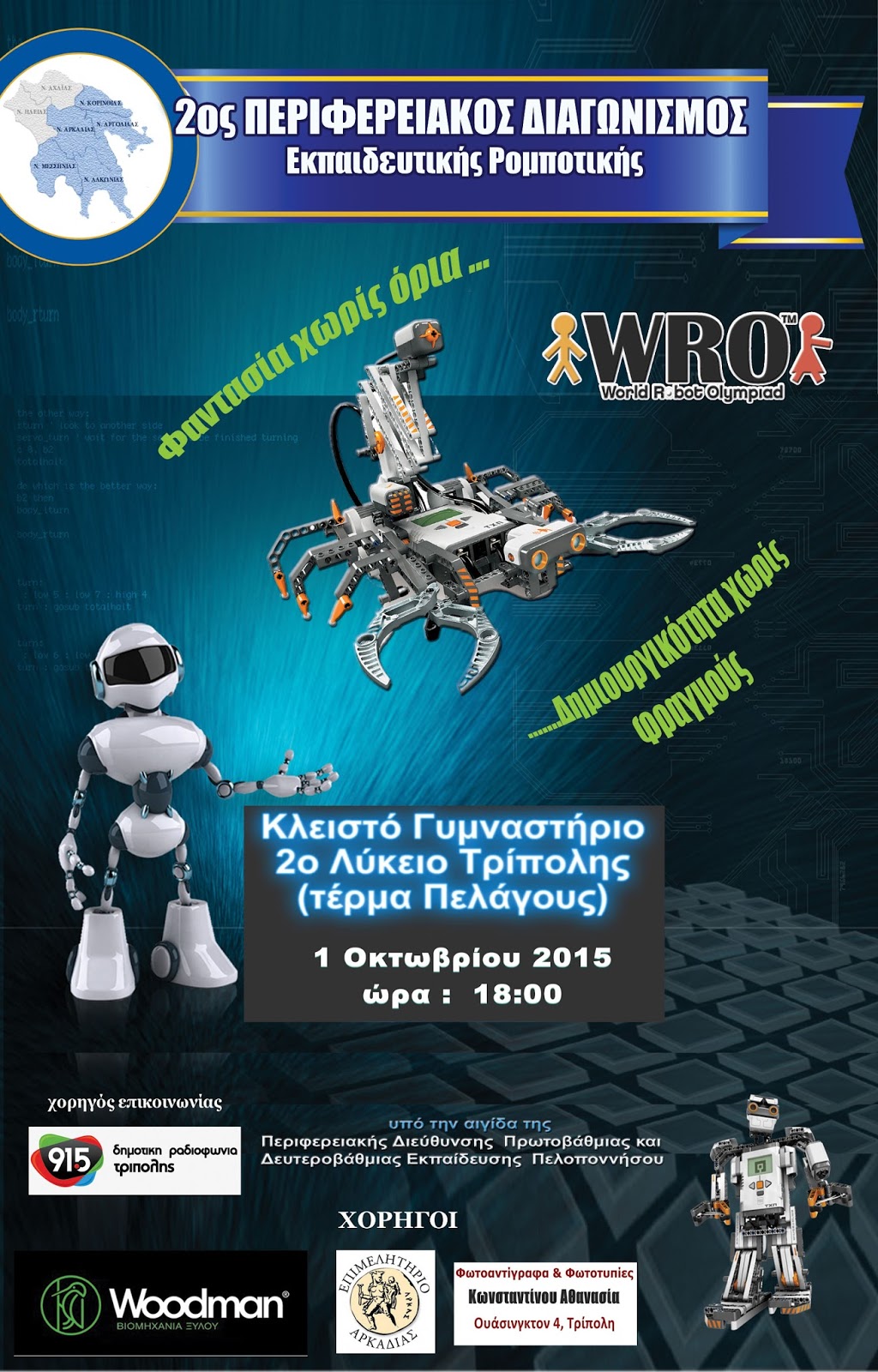 Ο 2ος Περιφερειακός Διαγωνισμός Εκπαιδευτικής Ρομποτικής Πελοποννήσου, πρόκειται να διεξαχθεί στην πόλη της Τρίπολης την Πέμπτη 01.10.2015 και ώρα 15:00 στο Κλειστό Γυμναστήριο του 2ουΓενικού Λυκείου Τρίπολης (τέρμα Πελάγους). Οι μαθητές, που έχουν δηλώσει συμμετοχή, θα διαγωνιστούν με ρομπότ που έχουν κατασκευάσει και θα αξιολογηθούν από κριτική επιτροπή. Η διοργάνωση διεξάγεται ενόψει του Εθνικού Διαγωνισμού που πραγματοποιείται από τον Οργανισμό Εκπαιδευτικής Ρομποτικής και Επιστήμης WRO HELLAS (www.WROHellas.gr), υποστηρίζεται από επιστημονικές οργανώσεις και τελεί υπό την αιγίδα του Υπουργείου Πολιτισμού, Παιδείας & Θρησκευμάτων. Οι δύο νικήτριες ομάδες του Εθνικού Διαγωνισμού θα εκπροσωπήσουν την Ελλάδα στην Ολυμπιάδα Εκπαιδευτικής Ρομποτικής (World Robot Olympiad – www.wro2015.org) που διοργανώνεται φέτος στη Ντόχα του Κατάρ στις 6-8 Νοεμβρίου.