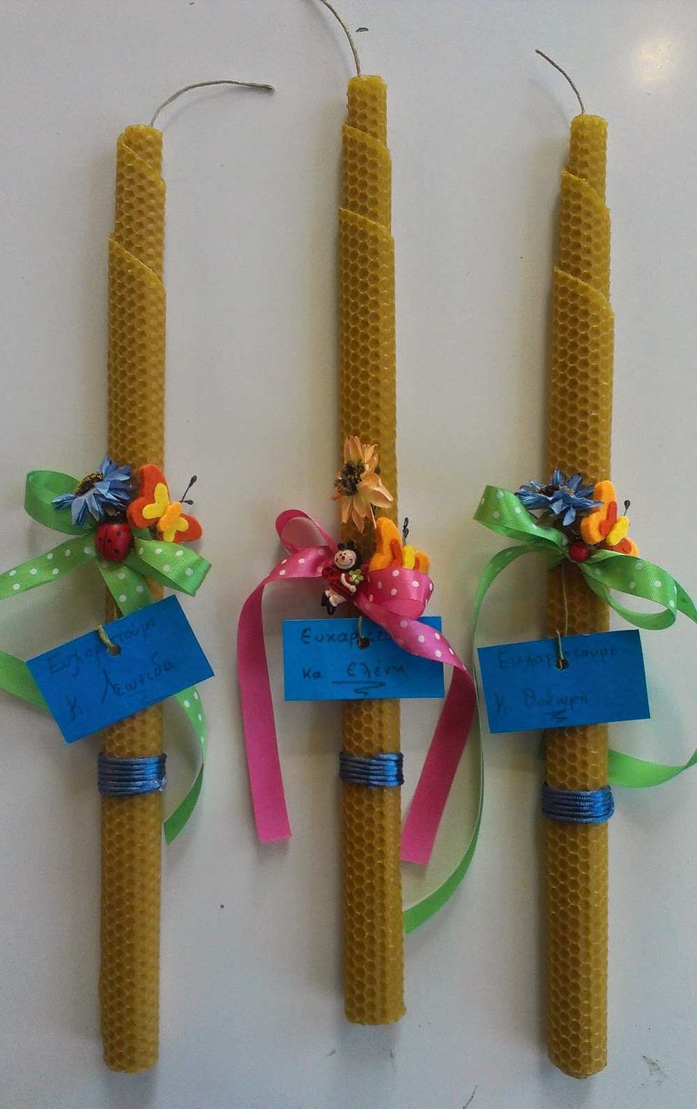 Ευχαριστούμε επίσης τον κ. Λεωνίδα Π. για την προσφορά υλικών για την κατασκευή των πασχαλιάτικων λαμπάδων μας, που υλοποιήσαμε στο πλαίσιο του περιβαλλοντικού προγράμματός μας.