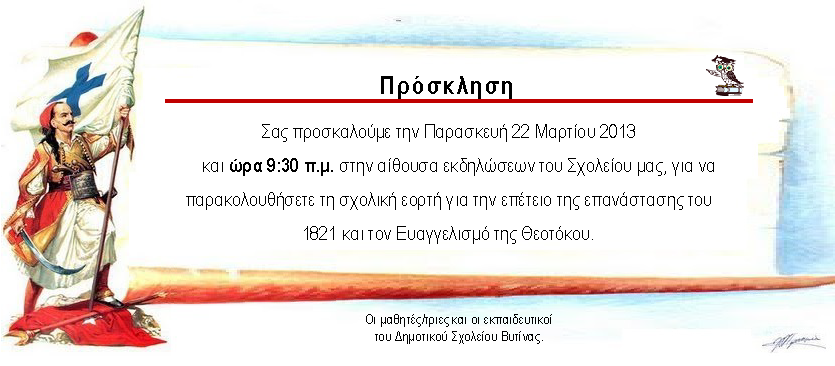 Πρόσκληση εορτασμού 25ης Μαρτίου Primary School of Vytina 21 Μαρτίου 2013 Εκδηλώσεις Δεν επιτρέπεται σχολιασμός στο Πρόσκληση εορτασμού 25ης Μαρτίου