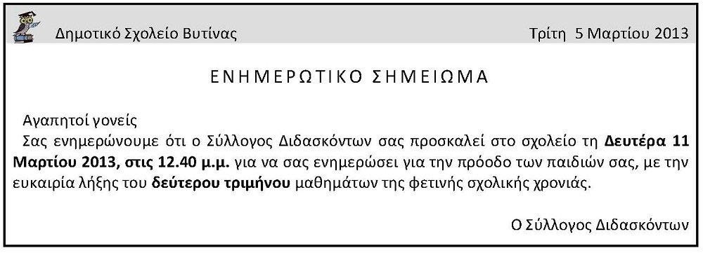 Λήξη 2ου τριμήνου και ενημέρωση γονέων Primary School of Vytina 5 Μαρτίου 2013 Χωρίς κατηγορία Δεν επιτρέπεται σχολιασμός στο Λήξη 2ου τριμήνου και ενημέρωση γονέων