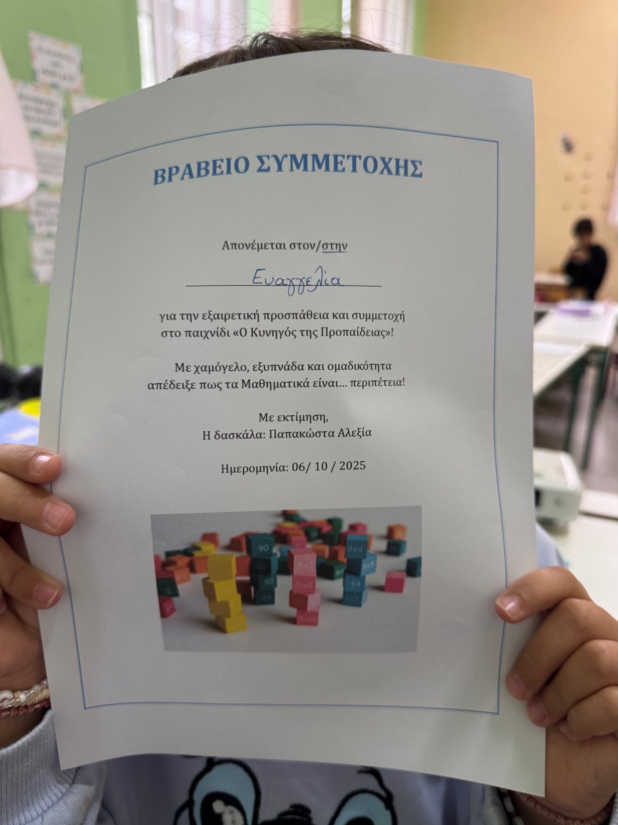 Σήμερα οι μαθητές της Γ τάξης ολοκλήρωσαν με επιτυχία τον «μαραθώνιο πολλαπλασιασμού»! Ξεκινώντας από την προηγούμενη εβδομάδα θυμηθήκαμε τις προπαίδειες που είχαμε διδαχθεί στην Β τάξη! Ξεκινήσαμε από το σχολικό βιβλίο, στη συνέχεια χρωματίσαμε τις προπαίδειες σε φύλλα εργασίας, φτιάξαμε το δικό μας μπρελόκ ώστε να μπορούμε να ανατρέχουμε σε αυτό οποιαδήποτε στιγμή χρειαστεί, κάναμε παιχνίδια προπαίδειας στον υπολογιστή και ολοκληρώσαμε αυτόν τον «μαραθώνιο» παίζοντας ένα ομαδικό παιχνίδι στην τάξη! Η νικήτρια ομάδα κέρδισε το χειροκρότημα όλων και φυσικά όλοι λάβαμε το βραβείο μας!