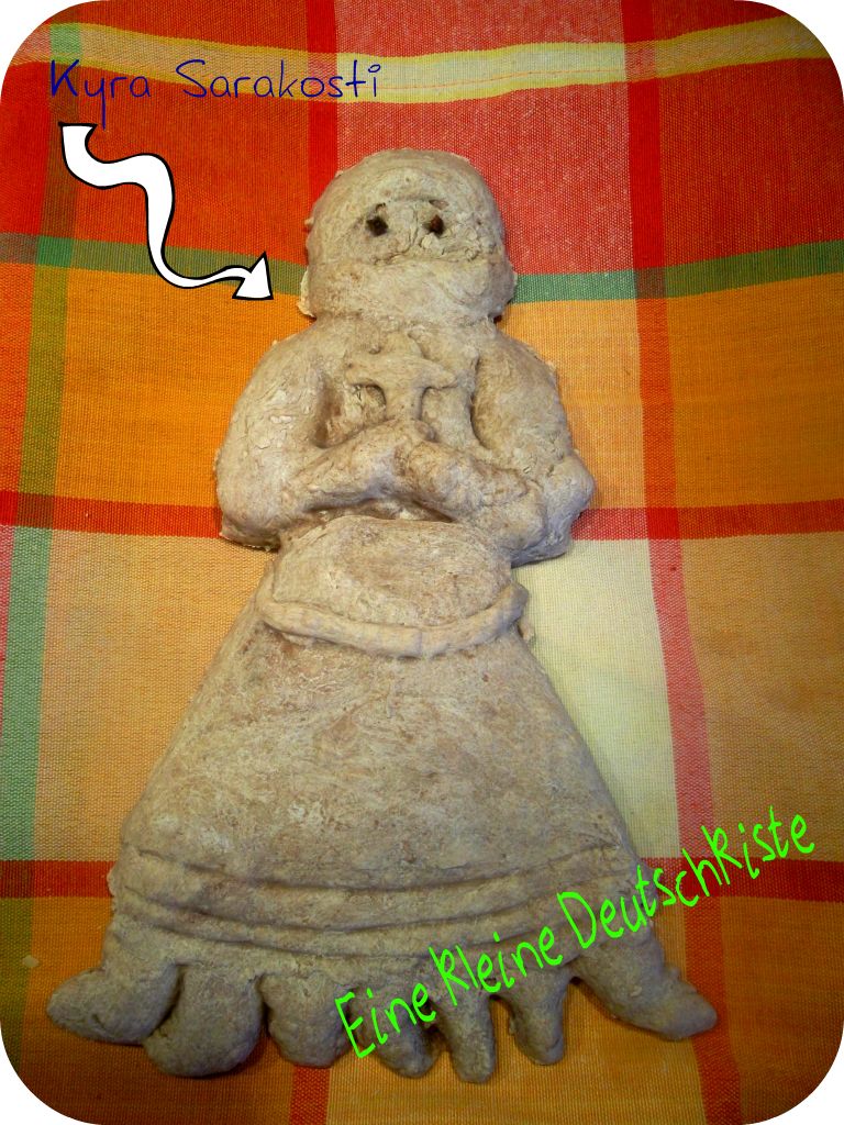 Wir haben die Zutaten zu einem geschmeidigen Teig geknetet und diesen dann auf eine Dicke von 2 cm ausgerollt. Mit einem Messerchen wurde die Form der Kyra Sarakosti ausgestochen. Und wir haben daran gebastelt, bis uns ihre Figur gefiel.
