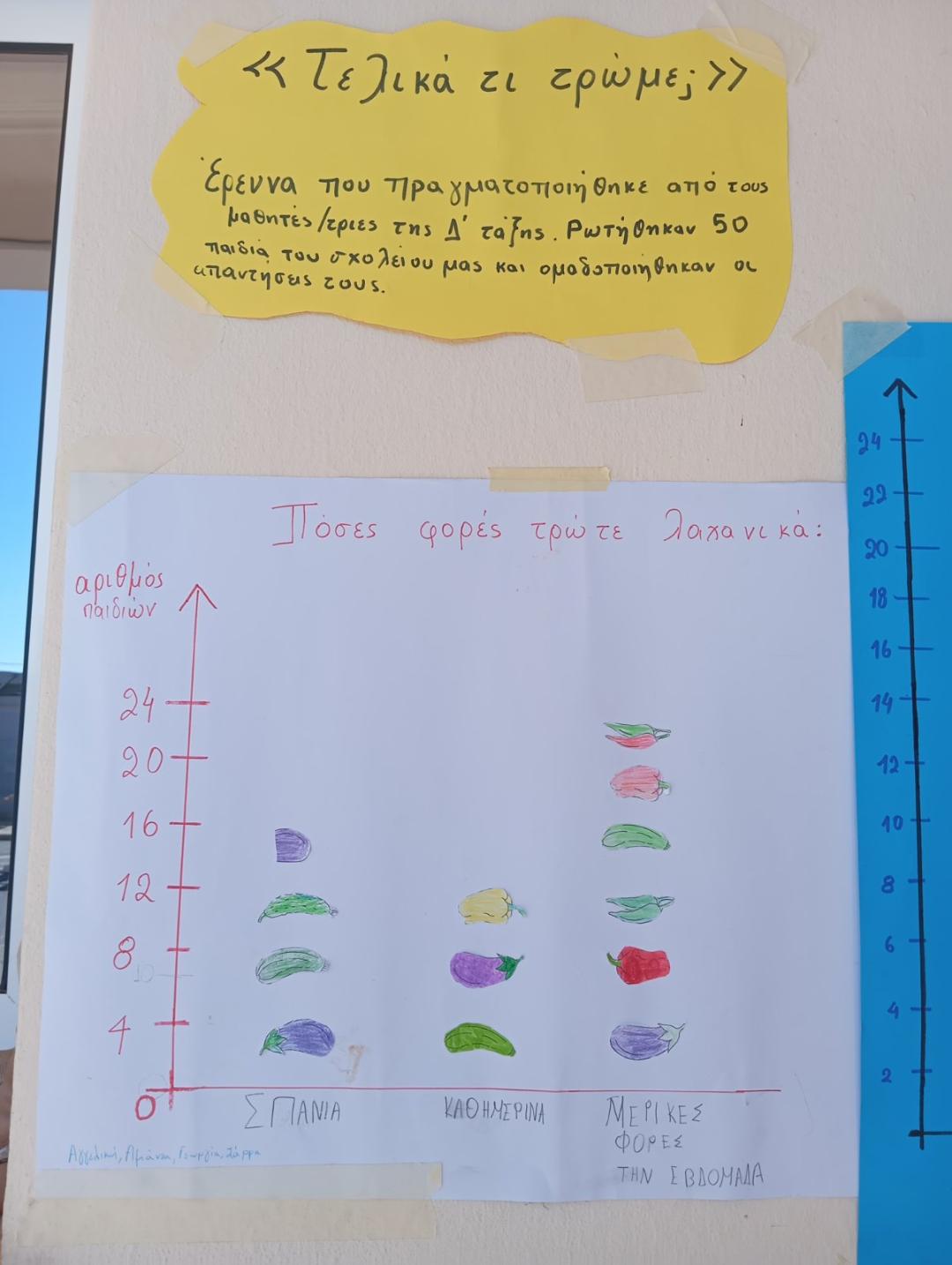 Επιπρόσθετα, οι μαθητές της Δ τάξης διεξήγαγαν έρευνα με τίτλο: «Τελικά τι τρώμε;»σε 50 μαθητές του σχολείου με σκοπό να αποτυπωθούν οι διατροφικές τους προτιμήσεις. Από τις απαντήσεις των παιδιών διαπιστώθηκε πως οι διατροφικές αυτής της ηλικιακής ομάδας χρειάζεται να γίνουν πιο υγιεινές.
