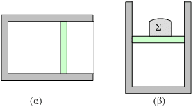 ii) Σηκώνουμε το δοχείο σε κατακόρυφη θέση (σχήμα (β), τοποθετούμε πάνω στο έμβολο σώμα Σ μάζας Μ=4,5kg και το αφήνουμε να ηρεμήσει.