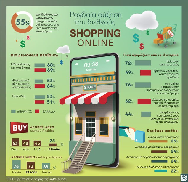 Με ταχείς ρυθμούς αυξάνονται διεθνώς οι αγορές μέσω του διαδικτύου, σύμφωνα με τα αποτελέσματα έρευνας της PayPal & Ipos. Στις 31 χώρες που συμμετείχαν στην έρευνα διαπιστώθηκε ότι οι καταναλωτές σε ποσοστό περίπου 55% πραγματοποιούν αγορές online επιλέγοντας προϊόντα από ηλεκτρονικά καταστήματα που εδρεύουν σε κάποια άλλη χώρα.