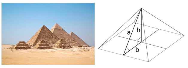 Μια κανονική πυραμίδα με βάση ένα τετράγωνο καθορίζεται από ένα εσωτερικό ορθογώνιο τρίγωνο, του οποίου οι πλευρές είναι το απόστημα της πυραμίδας (α),η ημι-βάση της (b) και το ύψος της (h). Η κλίση της γωνίας σημειώνεται επίσης. Οι μαθηματικές αναλογίες παρουσιάζουν ιδιαίτερο ενδιαφέρον σε σχέση με τις πυραμίδες της Αιγύπτου.