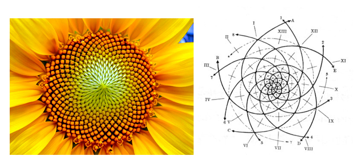 Οι σπόροι από ένα ηλιοτρόπιο σχηματίζουν ομόκεντρες σπείρες που ακολουθούν την κίνηση των δεικτών του ρολογιού αλλά και αντιστρόφως. Αν υπολογιστούν, προκύπτουν δύο αριθμοί το 21 και το 34 που ανήκουν στην ακολουθία Fibonacci.