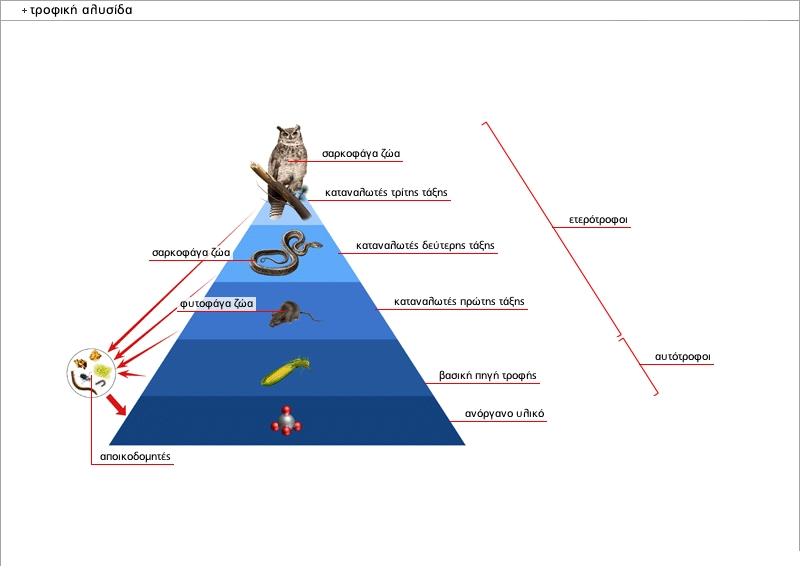 – τους ετερότροφους ή καταναλωτές (consumers): είναι οι ζωντανοί οργανισμοί που “καταναλώνουν” άλλους ζωντανούς οργανισμούς, φυτά ή ζώα. Όταν τρώνε μόνο φυτά τους λέμε φυτοφάγους όπως την αγελάδα, το ελάφι, τον σκίουρο, όταν τρώνε μόνο ζώα τους λέμε σαρκοφάγους όπως το λιοντάρι, ο λύκος, η αράχνη και όταν τρώνε και τα δύο τους λέμε παμφάγους όπως το γουρουνάκι, η αρκούδα, ο άνθρωπος .