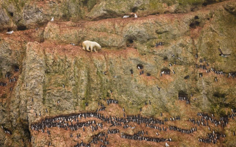 Η εικόνα αποτυπώνει την προσπάθεια μιας αρκούδας να φάει τα αυγά των πουλιών που προσεχτικά τα έχουν εναποθέσει στις φωλιές τους… Η φωτογραφία τραβήχθηκε στη Ρωσσία και απέσπασε το πρώτο βραβείο στην Κατηγορία «Φύση».