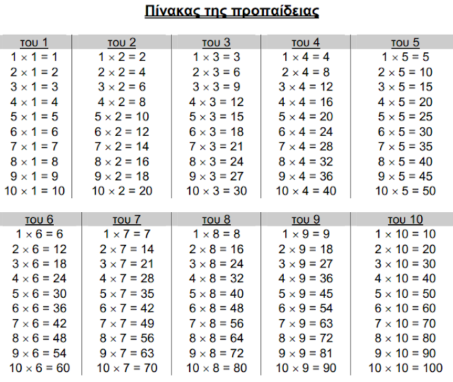 Με αυτό τον τρόπο διαβάζουμε κάθε φορά μία προπαίδεια ξεκινώντας από τις μικρότερες τις οποίες με την επανάληψη τις μαθαίνουμε απέξω και στη συνέχεια φτάνουμε στις μεγαλύτερες τελειώνοντας με αυτή του 10.