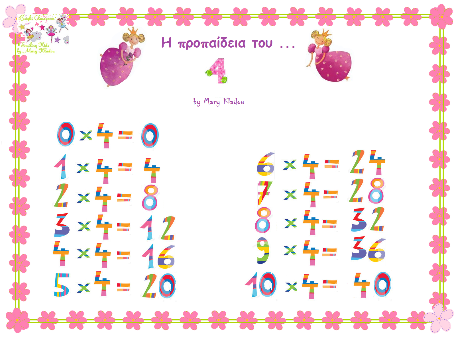1 Χ 4 = 4 ( 1 επί 4, 4 μας κάνει), βάτραχοι χορεύανε μες στο σιντριβάνι