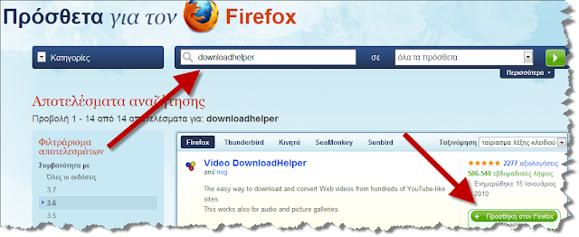 2. Κατόπιν πηγαίνουμε εδώ και αναζητούμε (στο πλαίσιο της αναζήτησης 🙂 το πρόσθετο downloadhelper. Αφού το βρούμε πατάμε δίπλα δεξιά “προσθήκη στο Firefox”. Περιμένουμε 3 δευτερόλεπτα και στο παράθυρο που θα εμφανιστεί πατάμε Εγκατάσταση τώρα.( Όσοι είναι πολύ βιαστικοί ας πατήσουν κατευθείαν εδώ). Αν δε γίνεται τίποτα στην κορυφή της καρτέλας του Firefox πατάμε να επιτρέπεται η εγκατάσταση του προσθέτου).