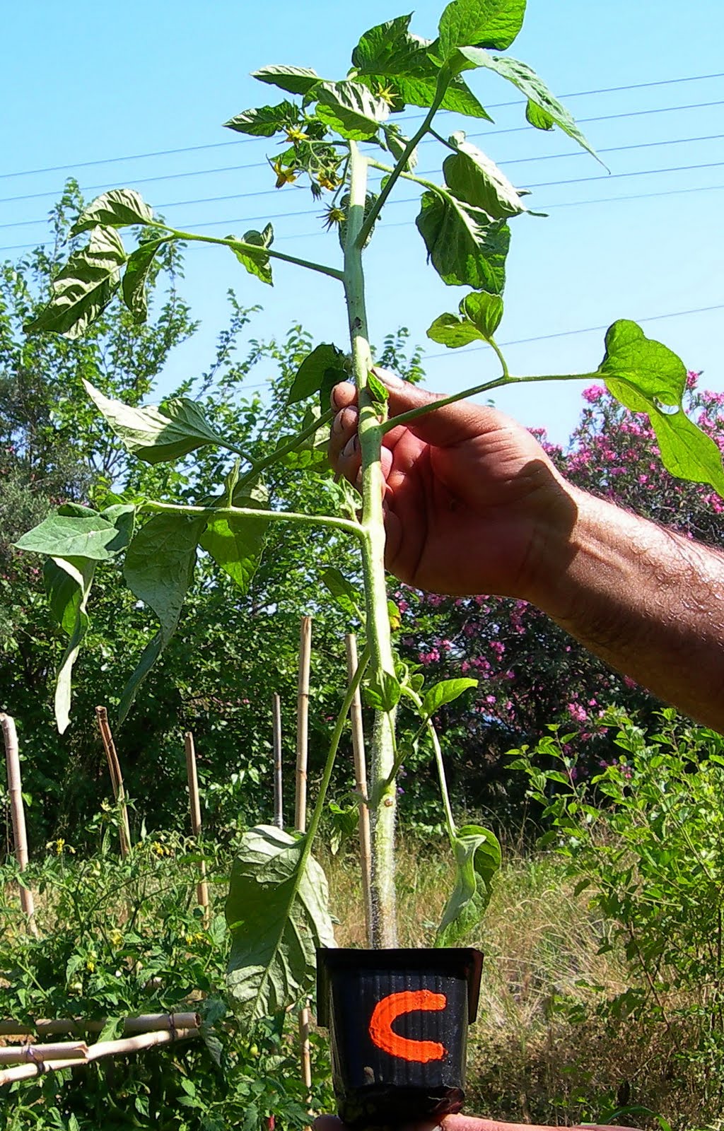 Οι δικές μου οι ντομάτες στα κυπελλάκια τους γίνονται 50 – 70 cm εξαιτίας της ειδικής “διατροφής”. Για τα υπόλοιπα φυτά δεν ριζοποτίζω τακτικά με το εκχύλισμα κομπόστ. Οι ντομάτες με ενδιαφέρει να έχουν ψηλό και γερό κορμό για να τις φυτέψω ξαπλωτές. Δηλαδή παραχώνω στο έδαφος όλο το ριζικό τους σύστημα και τον κορμό, αφήνοντας μόνο 10 εκατοστά του φυτού πάνω από την επιφάνεια φύτευσης. Έτσι εξασφαλίζω ένα φυτό με πολύ μεγάλες ρίζες και φυσικά ό,τι άλλο αυτό συνεπάγεται.