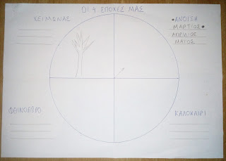 (ανάλογα με τις δυνατότητες του παιδιού, αν θέλουμε γράφουμε σε ένα χαρτί τις εποχές και το παιδί τις αντιγράφει. Παρατηρώντας την παραπάνω έγχρωμη εικόνα τις γράφει στο ανάλογο πεδίο. Το ίδιο γίνεται και με τους μήνες)