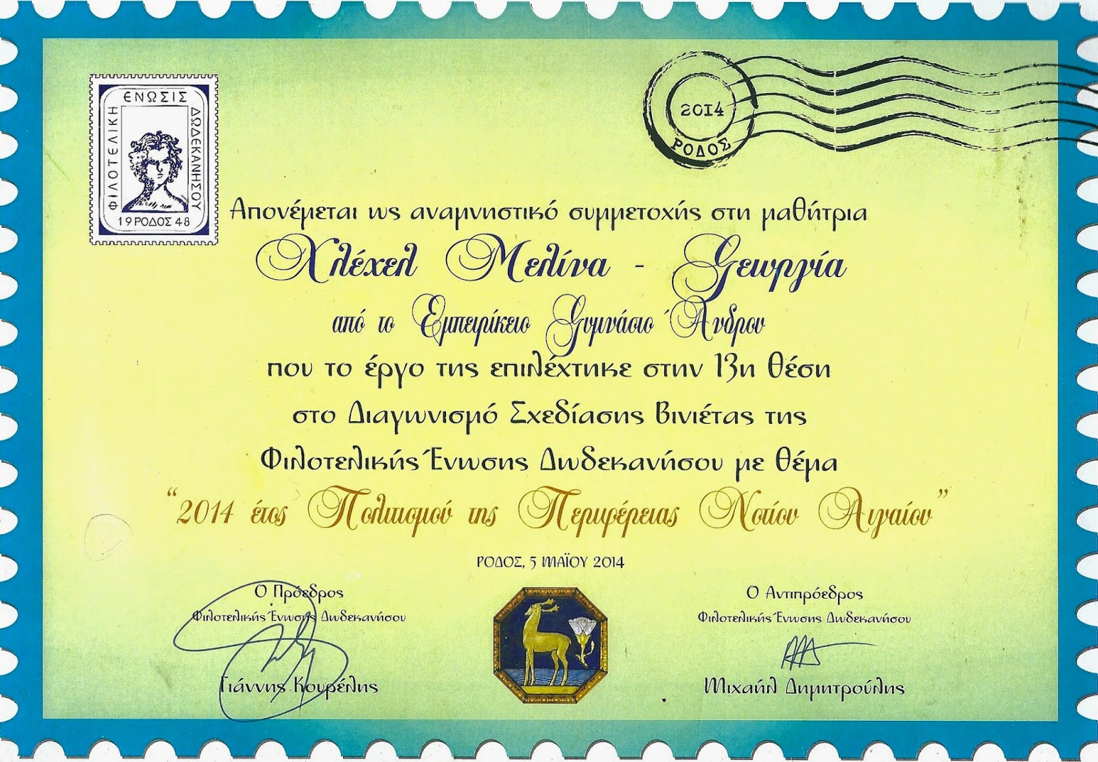 Η μαθήτρια της Α΄ τάξης του Εμπειρικείου Γυμνασίου Άνδρου, Μελίνα Χλέχελ, διακρίθηκε κατακτώντας την 13η θέση. Από το σχολείο μας συμμετείχαν στον διαγωνισμό 15 μαθητές, υπό την επίβλεψη της καθηγήτριας Στέλλας Στεφανή.