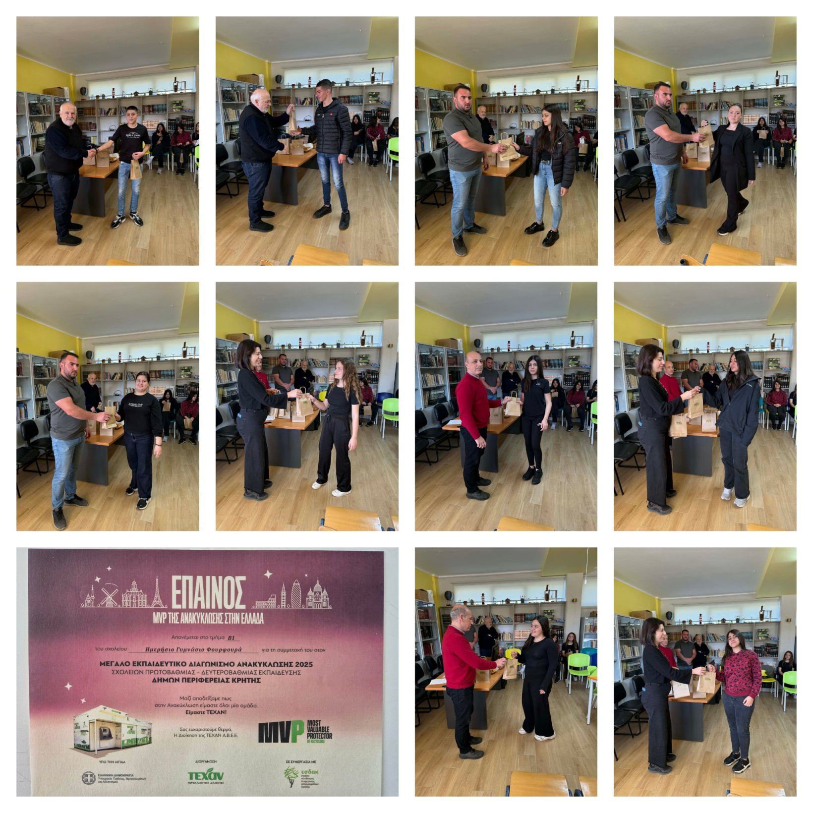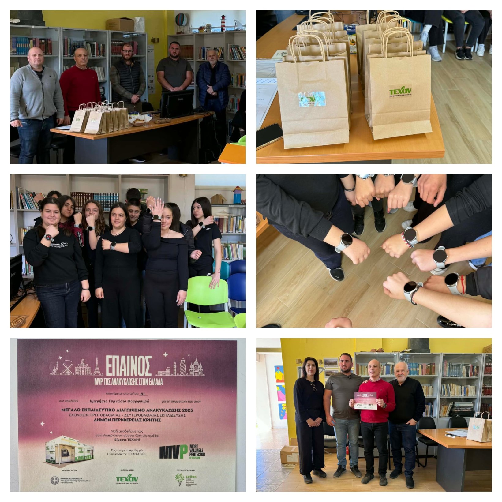 Οι μαθητές και οι μαθήτριες κατέκτησαν την πρώτη θέση στον Δήμο Αμαρίου, συγκεντρώνοντας τον μεγαλύτερο αριθμό ανακυκλώσιμων υλικών στα ειδικά «σπιτάκια» ανακύκλωσης της ΤΕΧΑΝ, τα οποία δέχονται πλαστικά μπουκάλια, κουτάκια αλουμινίου και γυάλινα μπουκάλια.