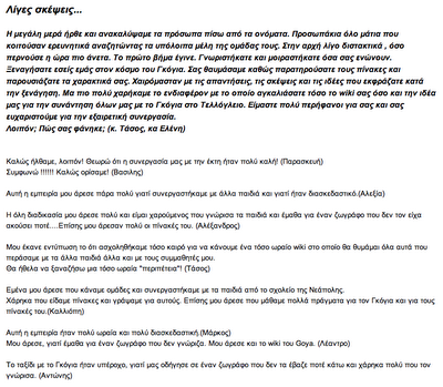 Και χθες ανακοινώθηκαν τα έργα που θα βραβευθούν στο “Θεσμό αριστείας και ανάδειξης καλών πρακτικών στην Α/θμια και Β/θμια εκπ/ση” και όλοι εμείς που συναντηθήκαμε μαζί σου είδαμε το wiki σου “Συνάντηση με το Γκόγιαστο Τελλόγλειο” στον κατάλογο των υπο βράβευση εργασιών.