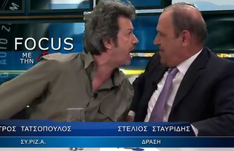 http://www.youtube.com/watch?feature=player_embedded&v=R0xjxws-Ers Πέτρος Τατσόπουλος βουλευτής του ΣΥΡΙΖΑ: «Ηλίθιε». Στέλιος Σταυρίδης, υποψήφιος της ΔΡΑΣΗΣ στον πολύ επιθετικό Π. Τατσόπουλο: «Δείρε με βρε ανθρωπάκο». Τατσόπουλος: «Αντε γαμήσου μαλάκα» (σηκώνεται και φεύγει). Σταυρίδης: «Να είσαι καλά αγόρι μου, στο καλό». Τατσόπουλος: «Να πας να γαμηθείς».