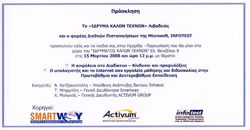που θα γίνει στο χώρο του "ΙΔΡΥΜΑΤΟΣ ΚΑΛΩΝ ΤΕΧΝΩΝ" Eλ. Βενιζέλου 8, στις 15 Μαρτίου 2008 και ώρα 12 μ.μ.
