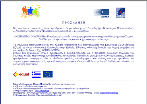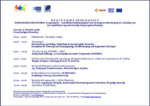 Το σεμινάριο πραγματοποιείται στο πλαίσιο υλοποίησης του προγράμματος της Κοινοτικής Πρωτοβουλίας EQUAL με τίτλο «Κοινωνική Οικονομία στην Ελλάδα. Πλαίσιο, πιλοτικές δοκιμές και δομές στήριξης της Αναπτυξιακής Σύμπραξης ΚΟΙΝΩΝ-ΟΙΚΟ».