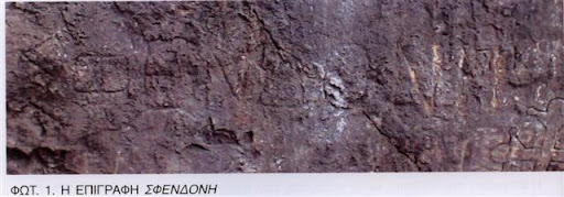 Η λέξη ΣΦΕΝΔΟΝΗ έχει χαραχθεί στο βράχο με μεγάλη προσοχή όσον αφορά την ομοιομορφία των γραμμάτων και τη σωστή του στοίχιση. Σε μεταγενέστερη εποχή, κάποιος έχει τονίσει με λιγότερο αιχμηρό αντικείμενο, τα δύο τελευταία γράμματα και χρονολογείται στους Ελληνιστικούς – Πρώιμους Ρωμαϊκούς χρόνους.