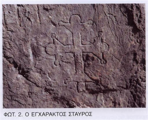 και δίπλα εγχάρακτο σταυρό 46 εκ. ύψος και 34 εκ. μήκος: ΦΩΤ. 2, που χρονολογείται από τον 14ο αιώνα Μ.Χ. και μετά.