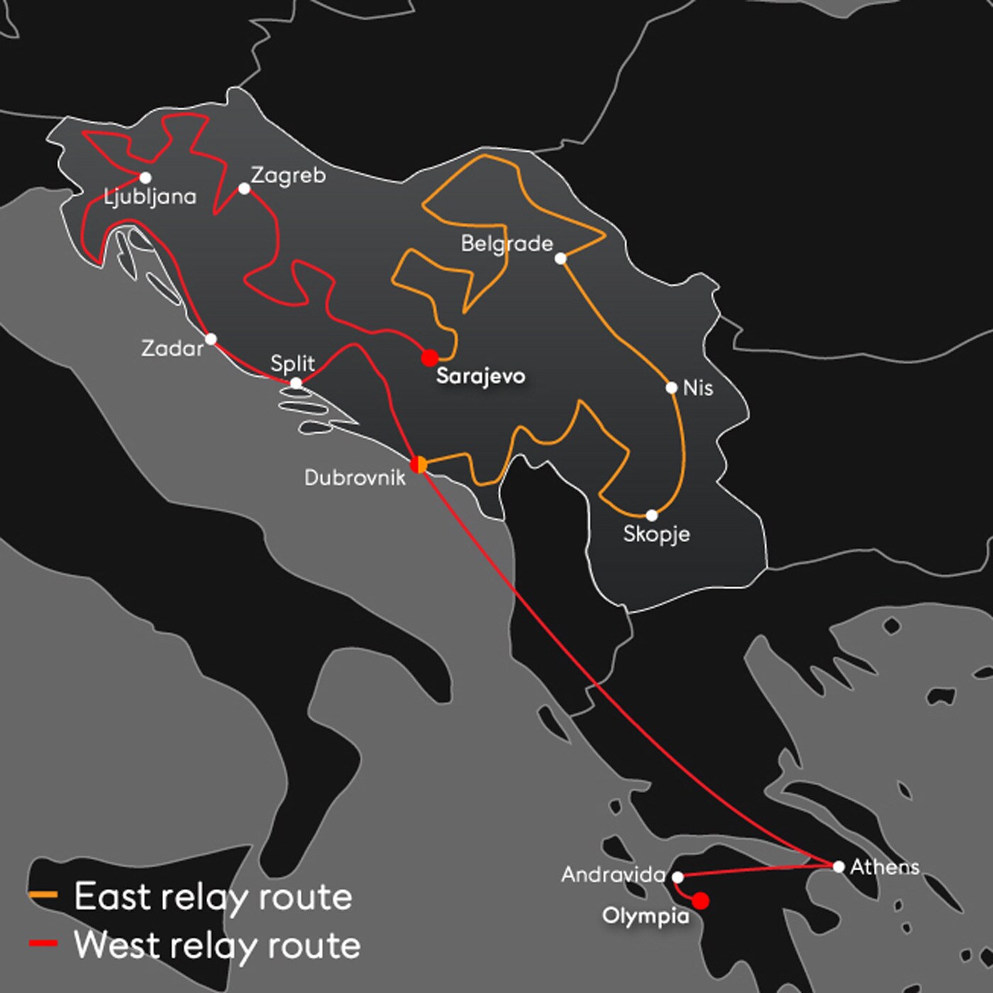 Start date: 29 January 1984, Olympia (Greece) – End date: 8 February 1984, Koševo Stadium, Sarajevo (Yugoslavia)
