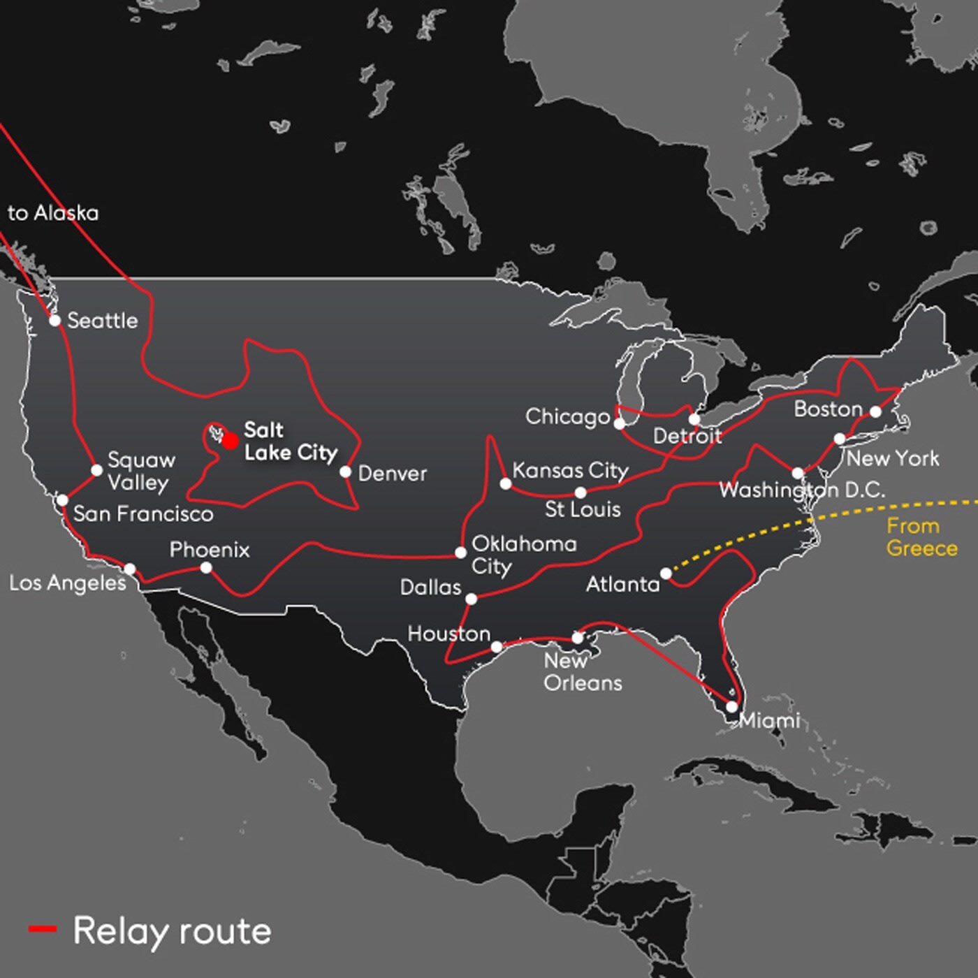 Start date: 19 November 2001, Olympia (Greece) – End date: 8 February 2002, Rice-Eccles Olympic Stadium, Salt Lake City (United States)
