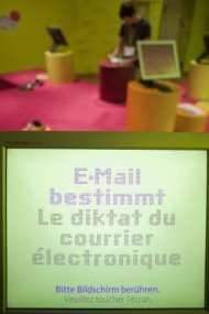 Μόλις μπαίνει ο επισκέπτης, ανακαλύπτει σε ένα μακρύ δωμάτιο ημιβυθισμένο στο σκοτάδι 12.000 βιβλία στοιβαγμένα σε ράφια. Σύμφωνα με τα λόγια της παράστασης, αν όλοι οι κάτοικοι της Γης συμμετείχαν στην επεξεργασία των δεδομένων που δημοσιεύονται στον κόσμο, θα έπρεπε ο καθένας να διαβάσει περίπου 12.000 βιβλία ημερησίως.«Βασικά η επικοινωνία είναι κάτι το σημαντικό, κάτι που χαροποίει, αλλά σήμερα υπάρχει πλημμύρισμα πληροφοριών», δήλωσε στο Γαλλικό Πρακτορείο η Jacqueline Strauss, διευθύντρια του Μουσείου της Επικοινωνίας,.Προσθέτει: «Μπορούμε να το συγκρίνουμε με το φαγητό. Μπορείτε να φάτε πάρα πολύ, μπορείτε να τρώτε πάντα το ίδιο (…), βλάπτει, αλλά αν έχουμε ισορροπημένη διατροφή είναι υγιή, δίνει χαρά, αισθάνεται κανείς άνετος».Σύμφωνα με τους ειδικούς του Πανεπιστήμιου της Βέρνης που συμμετέχουν στην έκθεση, ένας άνθρωπος μπορεί να διαβάσει ένα βιβλίο 350 σελίδων σε μια μέρα, αν συγκεντρώνεται και δεν έχει τίποτα άλλο να κάνει.Αλλά ο όγκος των πληροφοριών και των μηνυμάτων που εκπέμπονται σήμερα σε όλο τον κόσμο μέσω του Διαδικτύου, του ηλεκτρονικού ταχυδρομείου, τηλέφωνου, τύπου, ραδιόφωνου ή τηλεόρασης είναι περίπου 7.355 δισεκατομμύρια gigabytes, ήτοι δισεκατομμύρια βιβλία.