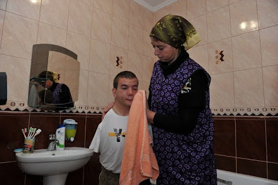 Κάθε μέρα η μητέρα του τον πλένει και τον βοηθάει να περιποιείται τον εαυτό του.